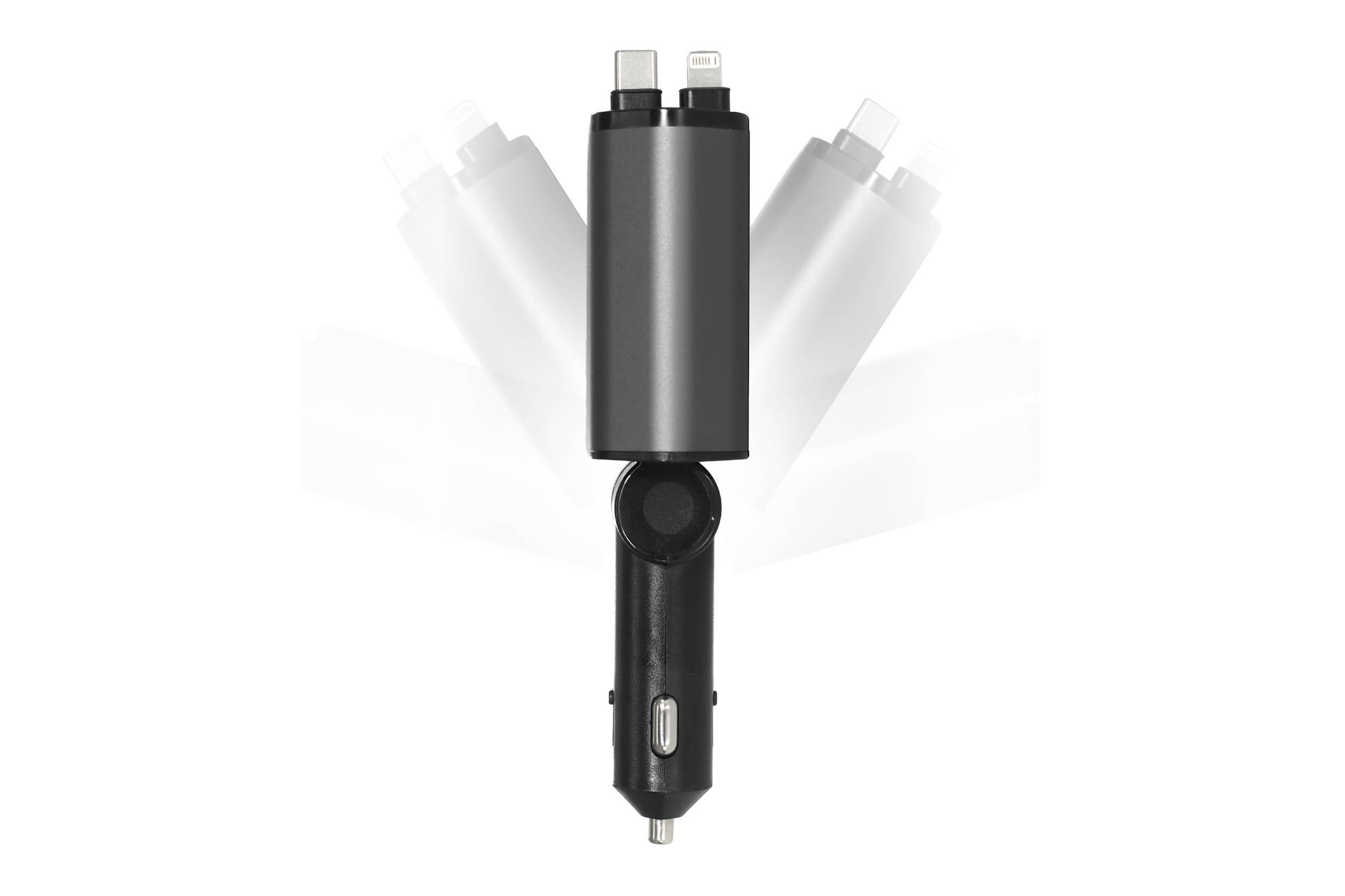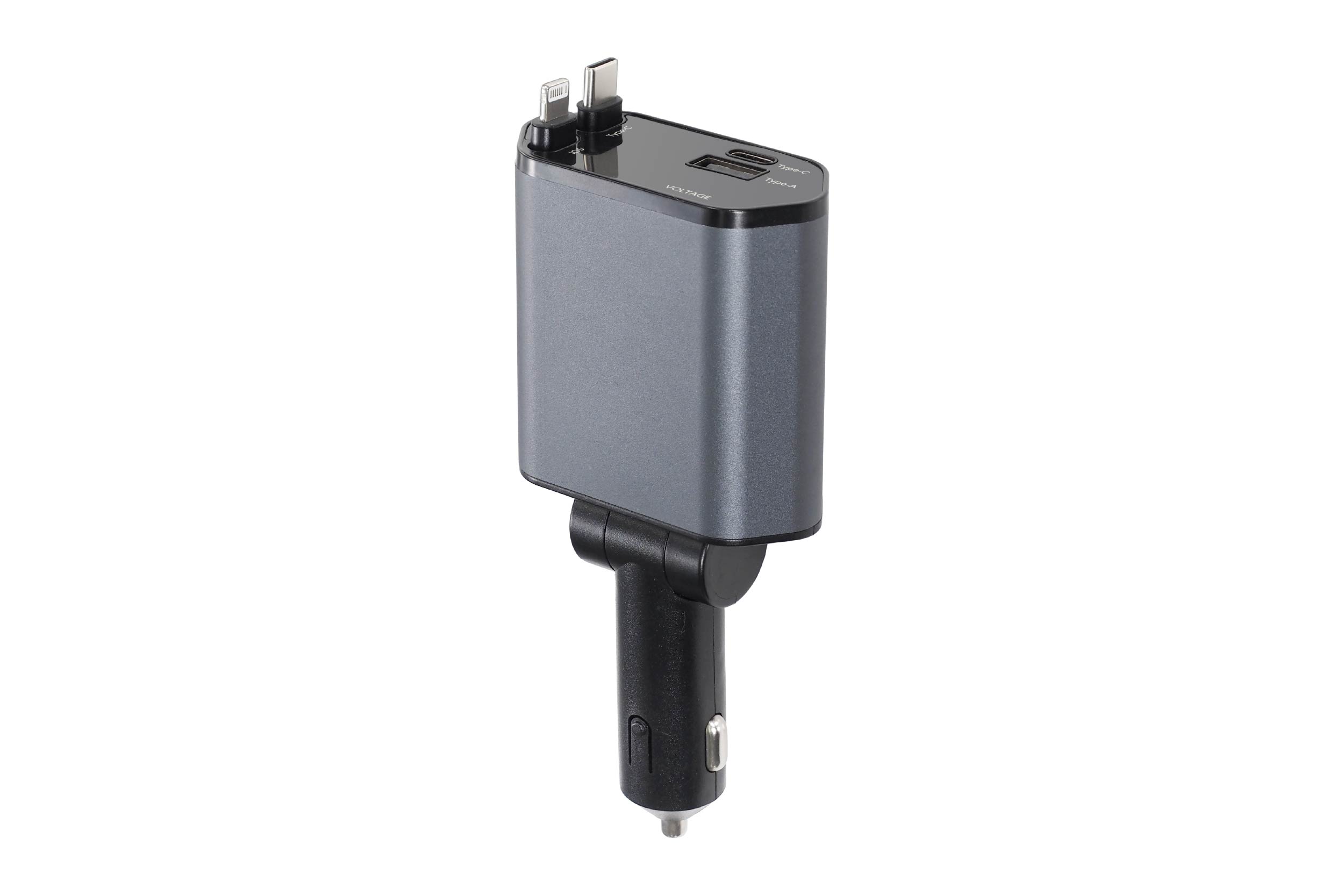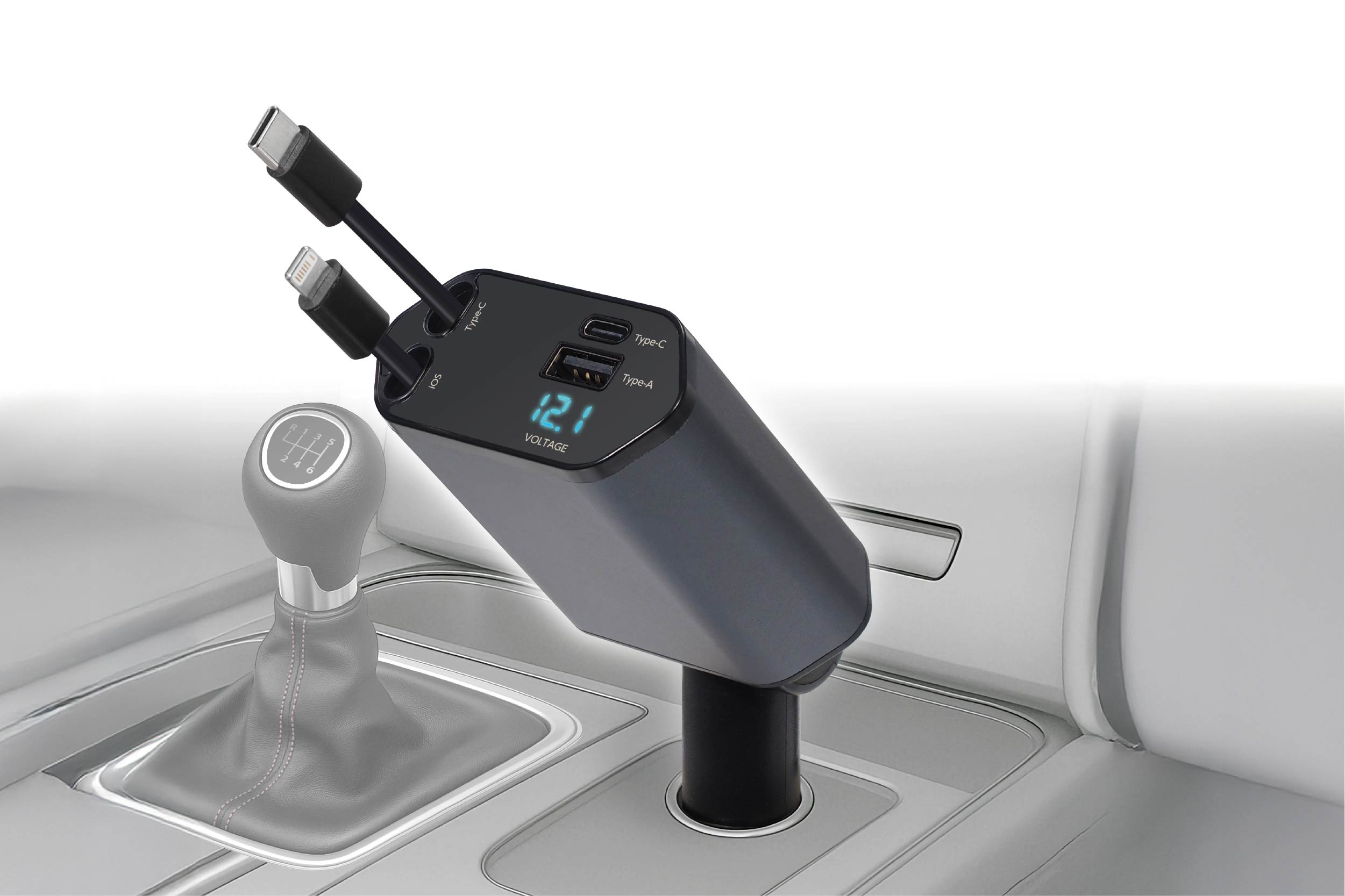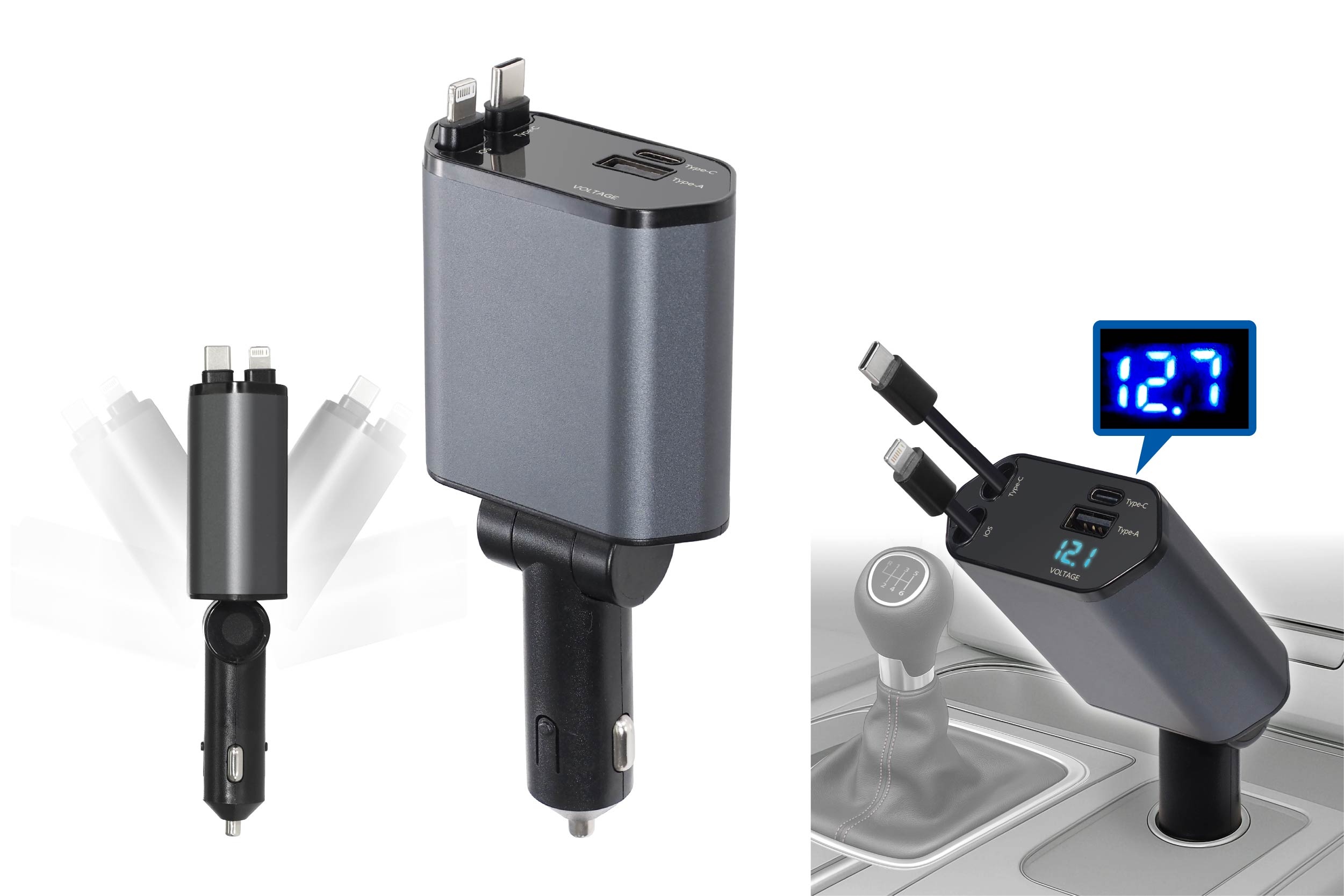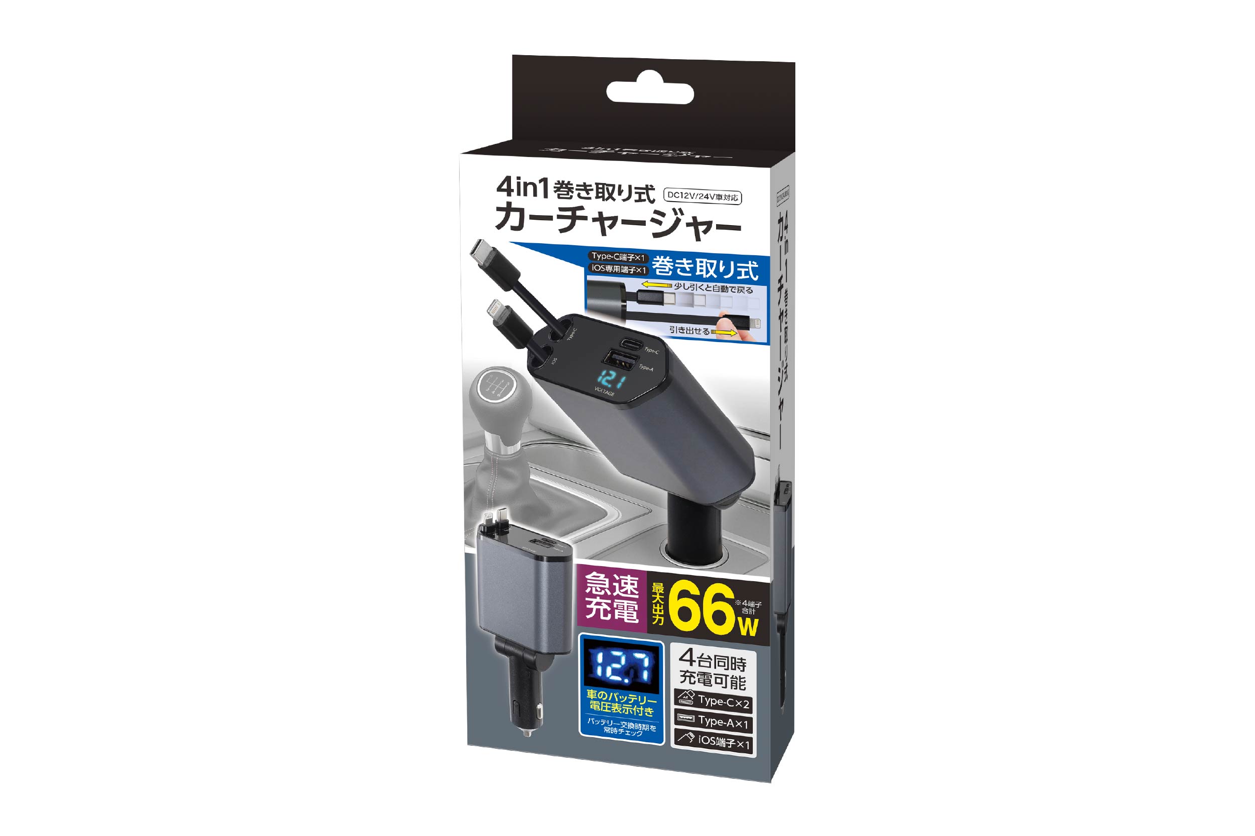 少し引くと自動で戻る!とっても便利な巻き取り式カーチャージャー!「type-A・type-C×2・iOS端子」を備えて4台同時充電可能!車のバッテリー電圧表示付きでバッテリー交換時期を常時チェックできます。支柱から約170°前後回転でき好きな角度に調節できます。あると便利なチャージャーをスマートに備えよう!