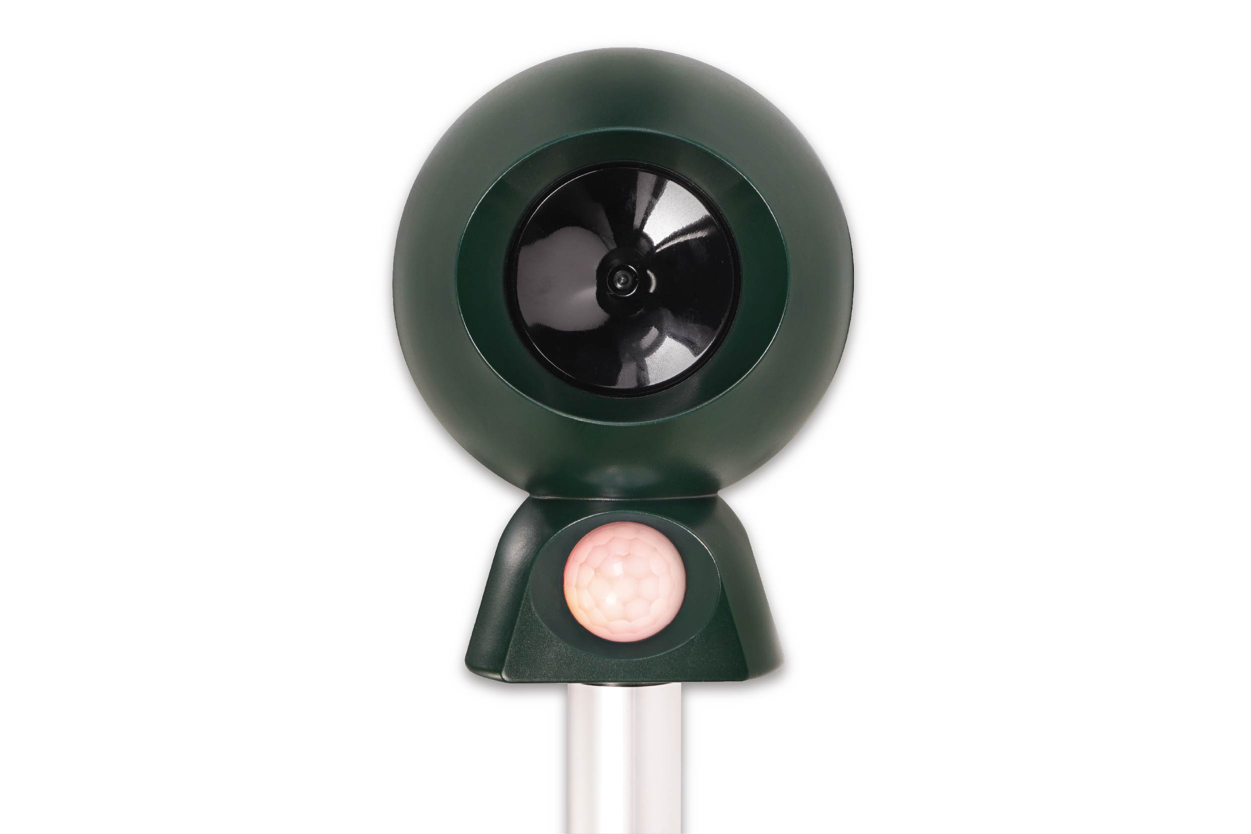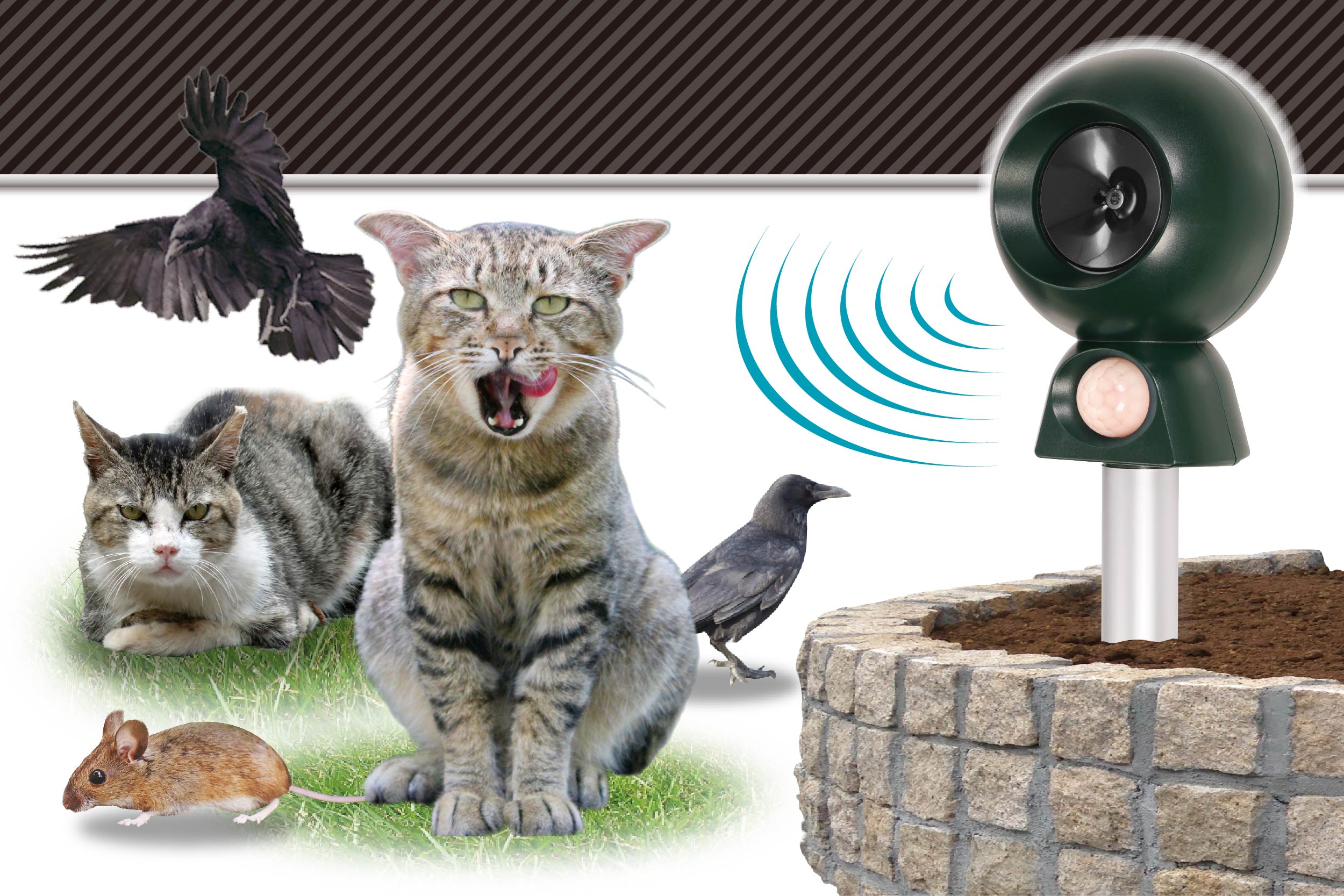 ネコ、ネズミ、カラス、イノシシなどを威嚇する動物退散センサー。動物が忌避する周波数の超音波を発信して、害獣や害鳥を近くに寄せ付けません。近づくと赤外線センサーが動物を検知し、自動で作動します。電池式で配線不要。菜園や畑の保護、野良猫・野良犬除け、夜行性動物の駆除などの用途に。