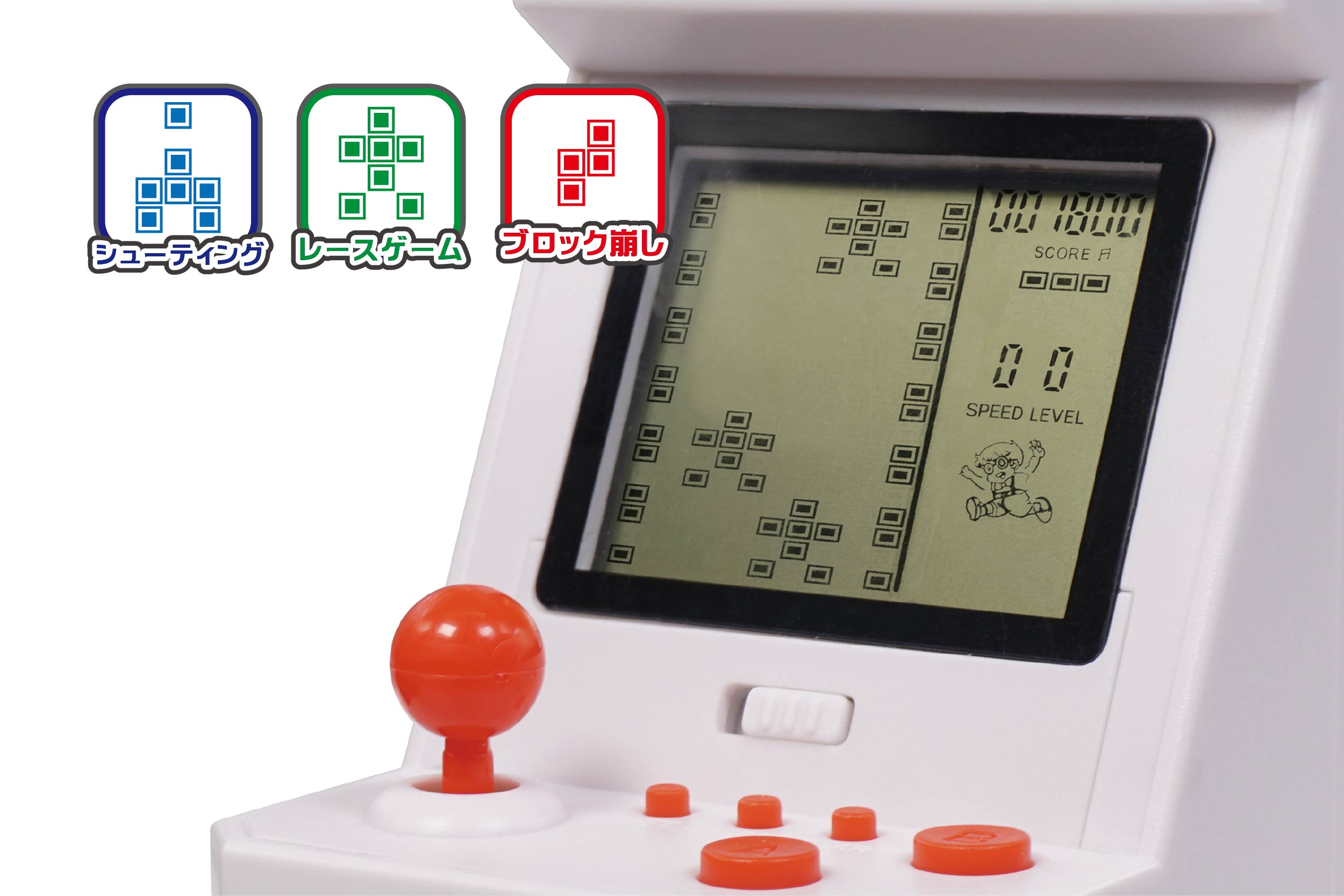 レトロ感のある昔懐かしいアーケードゲームが手のひらサイズになって登場!ゲームの難易度と速さは10段階で設定可能。レーシング、シューティング、ブロック崩しなど多彩なゲームを搭載。何度も挑戦して、高難易度のレベルをクリアできるかな?他のプレイヤーと競い合っても楽しいアーケードゲームで楽しもう!