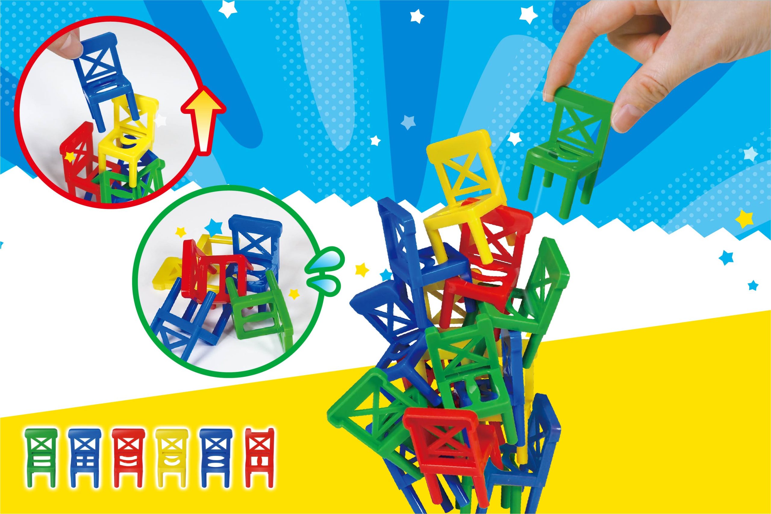 遊び方は無限大!?積んで重ねて楽しめる、バランスチェアゲーム。上にどんどん積み上げて遊んだり、重ねてタワーにもできる♪いろんな形のチェアを、バランスよく選んで崩れないように積み上げてみよう!