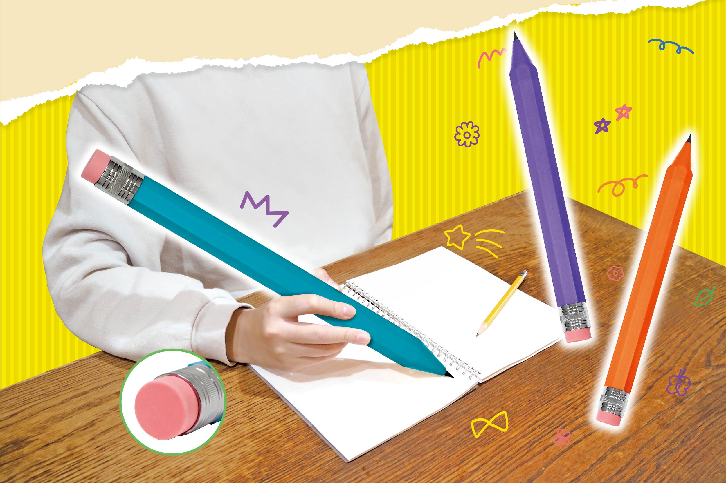 どでかい!全長35cmのえんぴつが登場!見た目のインパクトだけではなく、実際に書ける!?また背面の消しゴムも使用できます!おもむろに取り出して家族や友達をおどろかせてみよう。本体カラーは子供心をくすぐるブルー・パープル・オレンジの3色展開。保護キャップ付きで、インテリアオブジェにぴったりの雑貨アイテムです♪