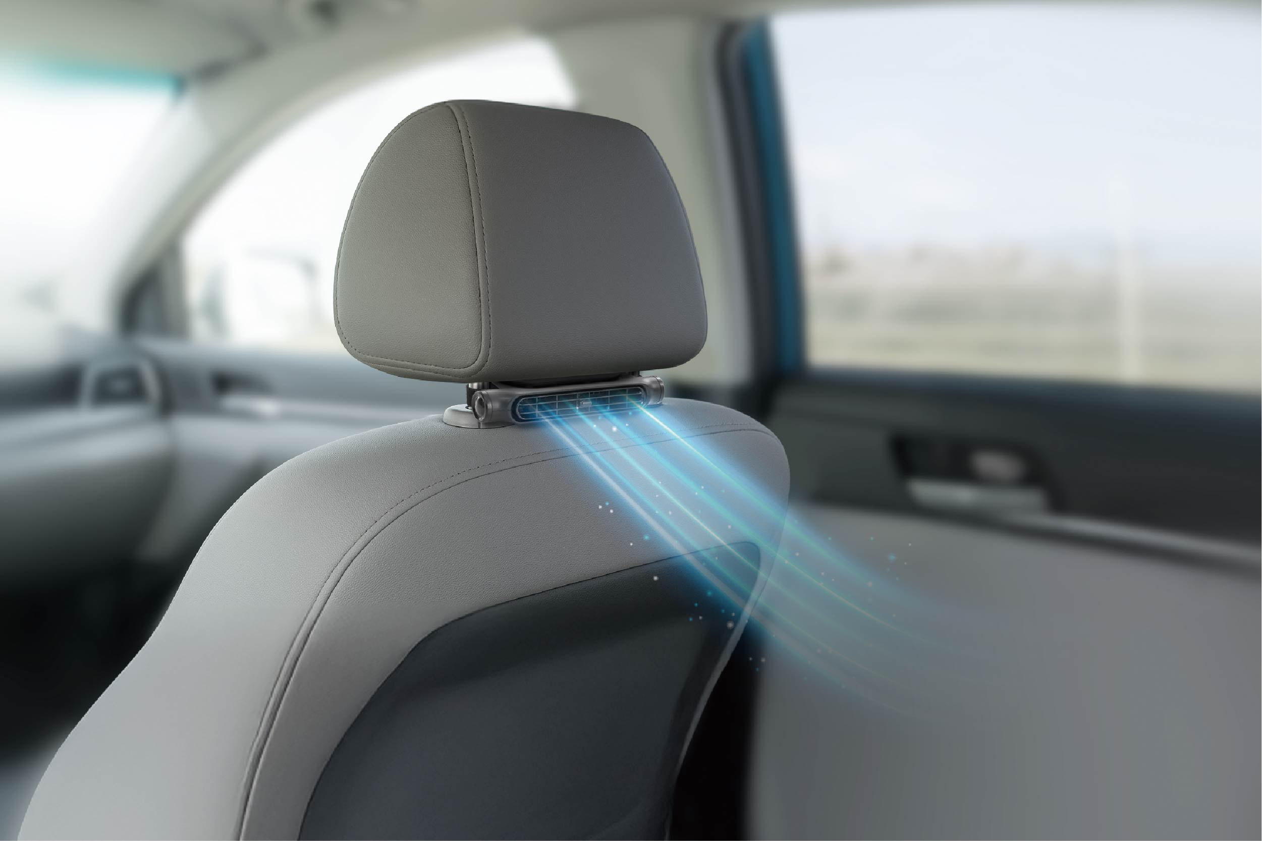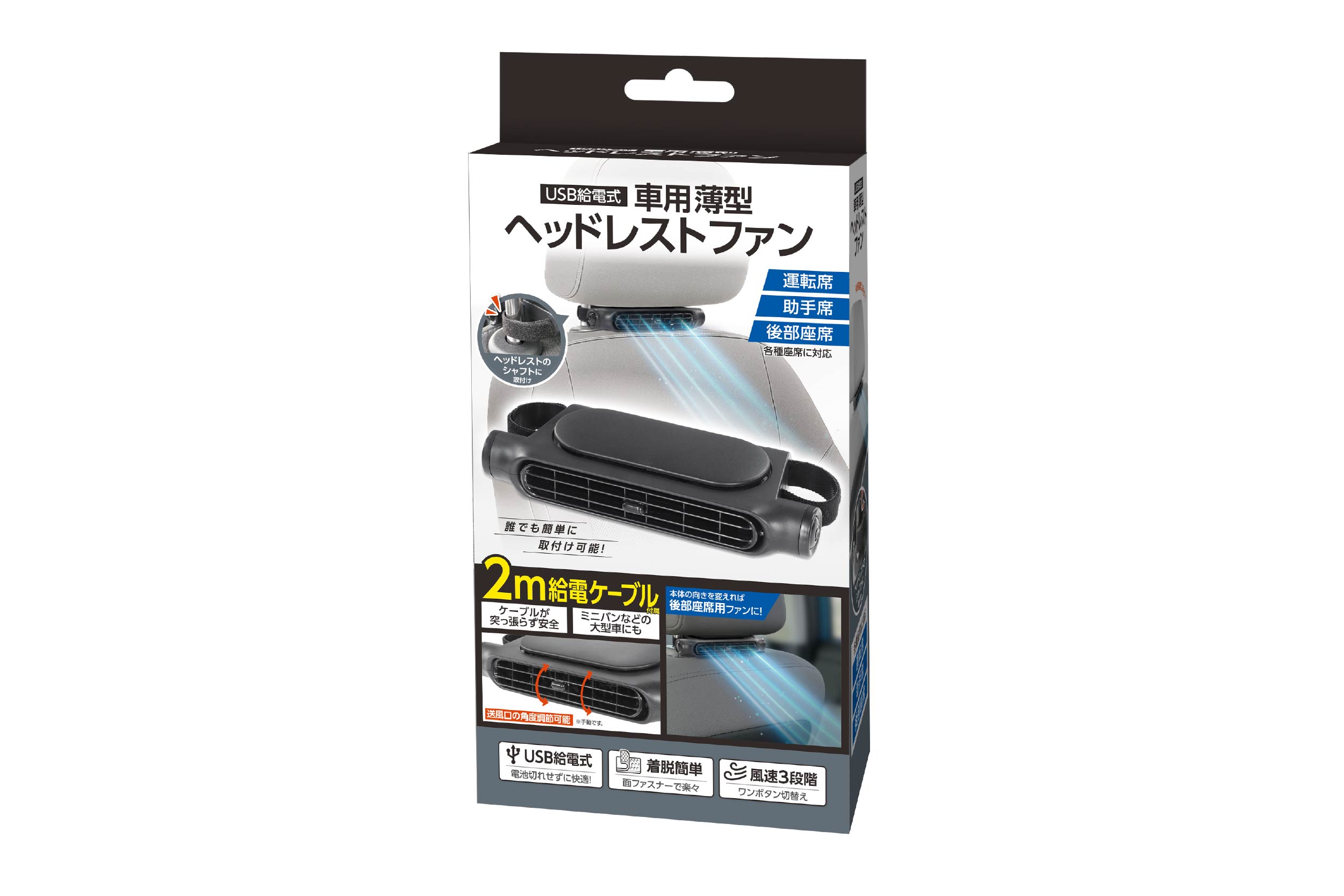 夏場の暑い季節でも車内環境を快適に♪ヘッドレストに装着してドライバーの首もとや背中部に送風します。送風口を反対に向けて後部座席にも送風可能。USB給電式でUSBポート、またはUSB変換アダプター(別売)に差し込むだけ。面ファスナーで誰でも簡単に取付け可能!全3段階の風量設定が可能で利便性が抜群!