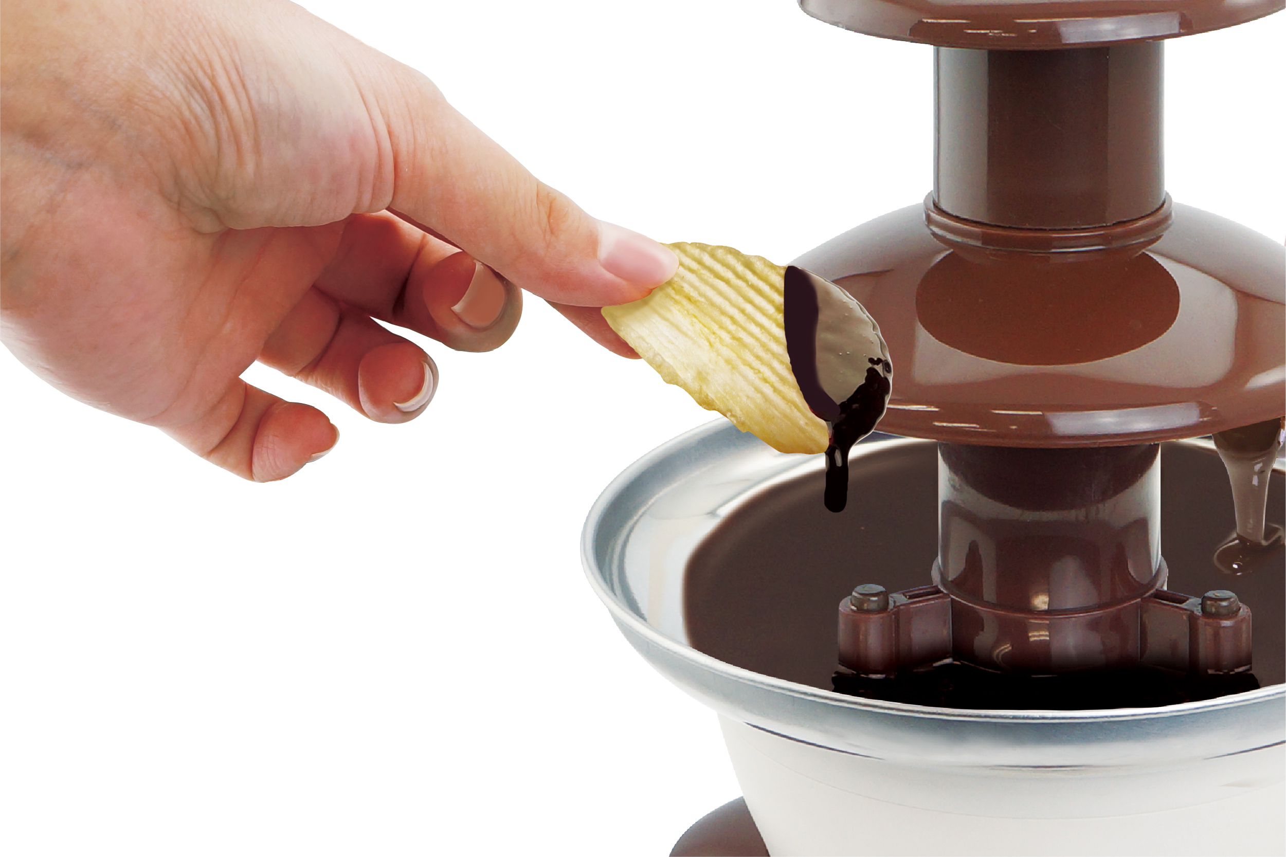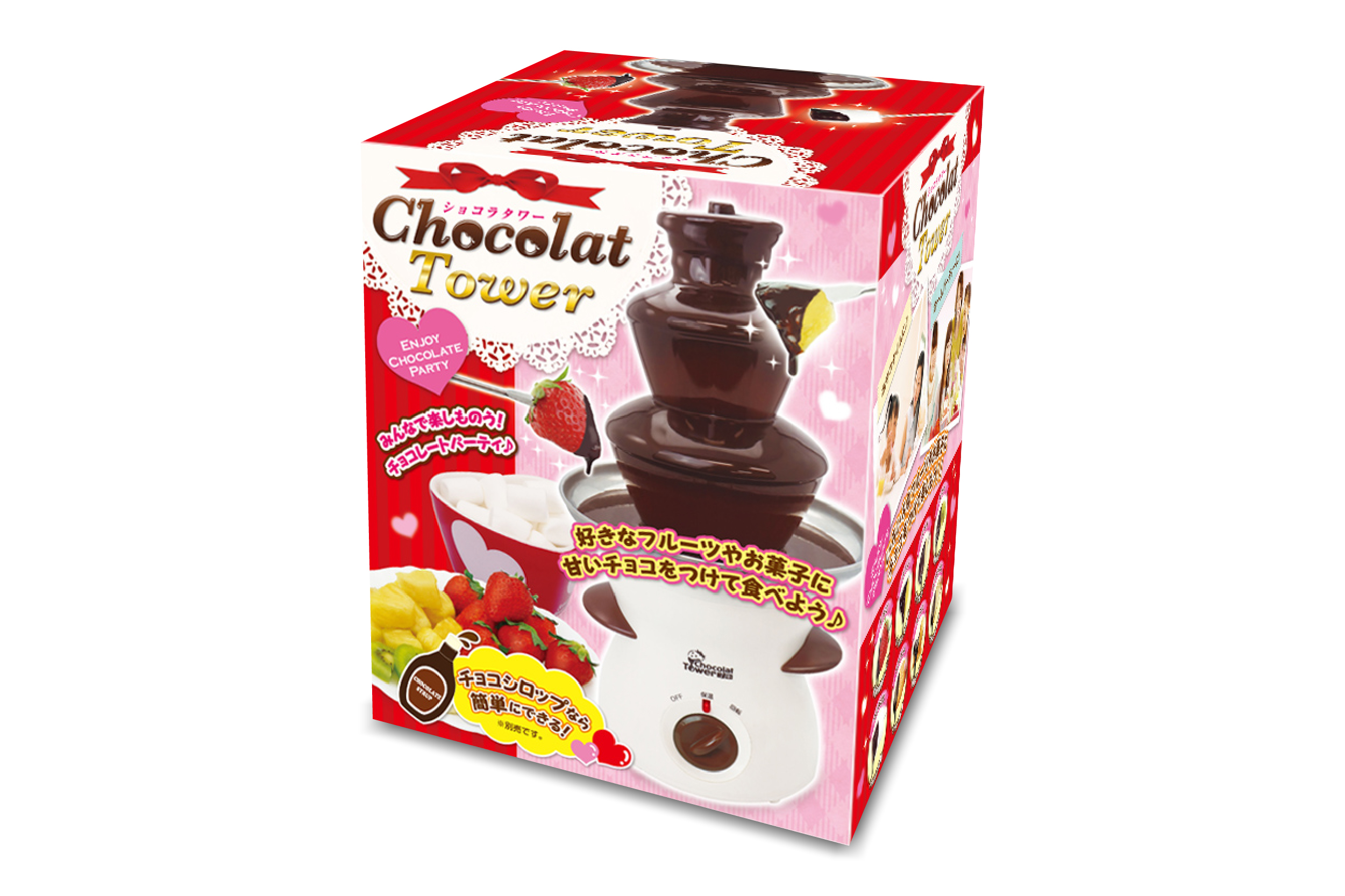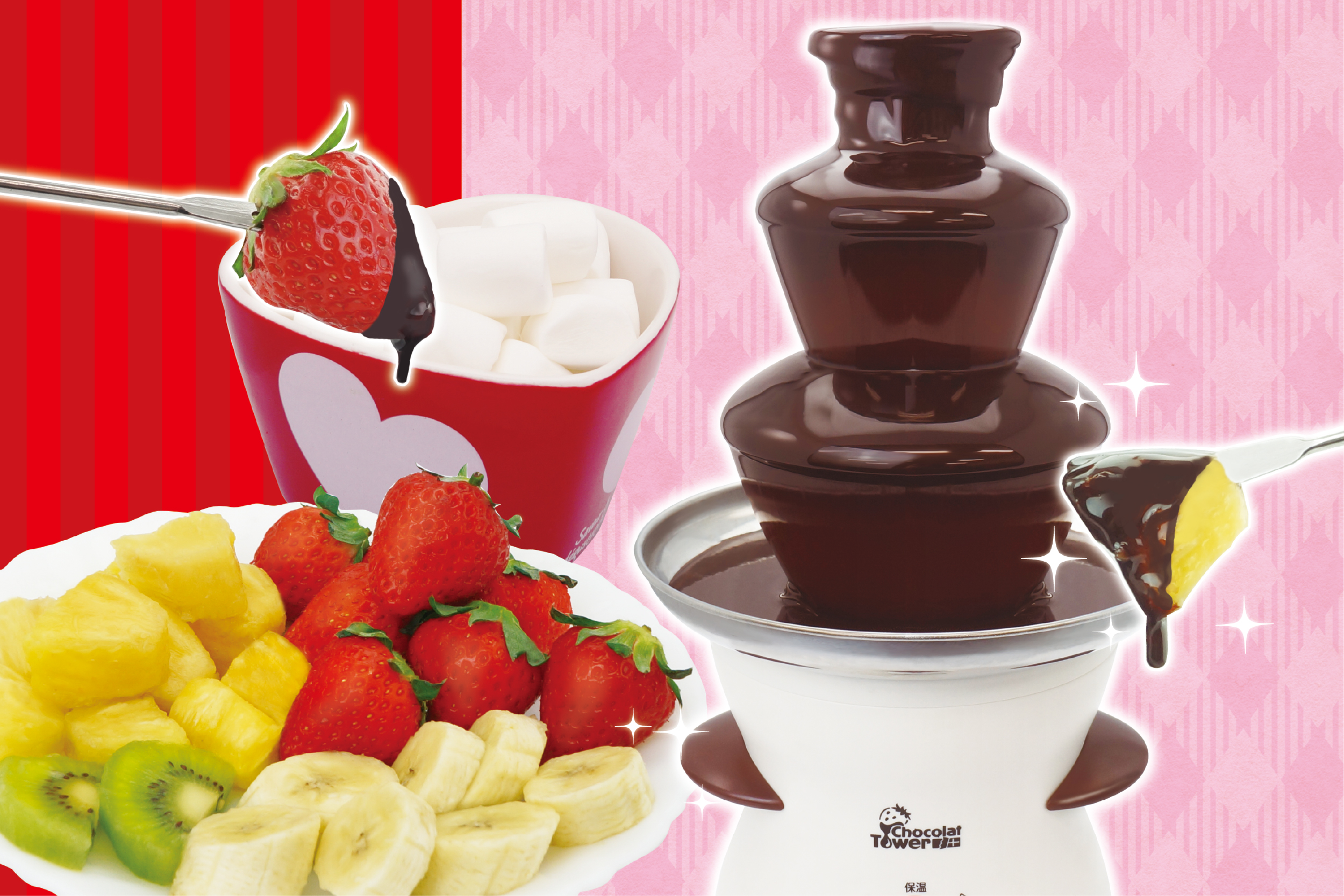 おうちで楽しくチョコパーティ♪高さ35cmのタワー式なので家族や友達みんなでチョコフォンデュを楽しめる。サクサク食感のクラッカー、フワフワ食感のマシュマロ、お好きなフルーツなどにチョコをたっぷりとディップして美味しい。クリスマスや誕生日会などのイベントがさらに楽しく盛り上がる♪