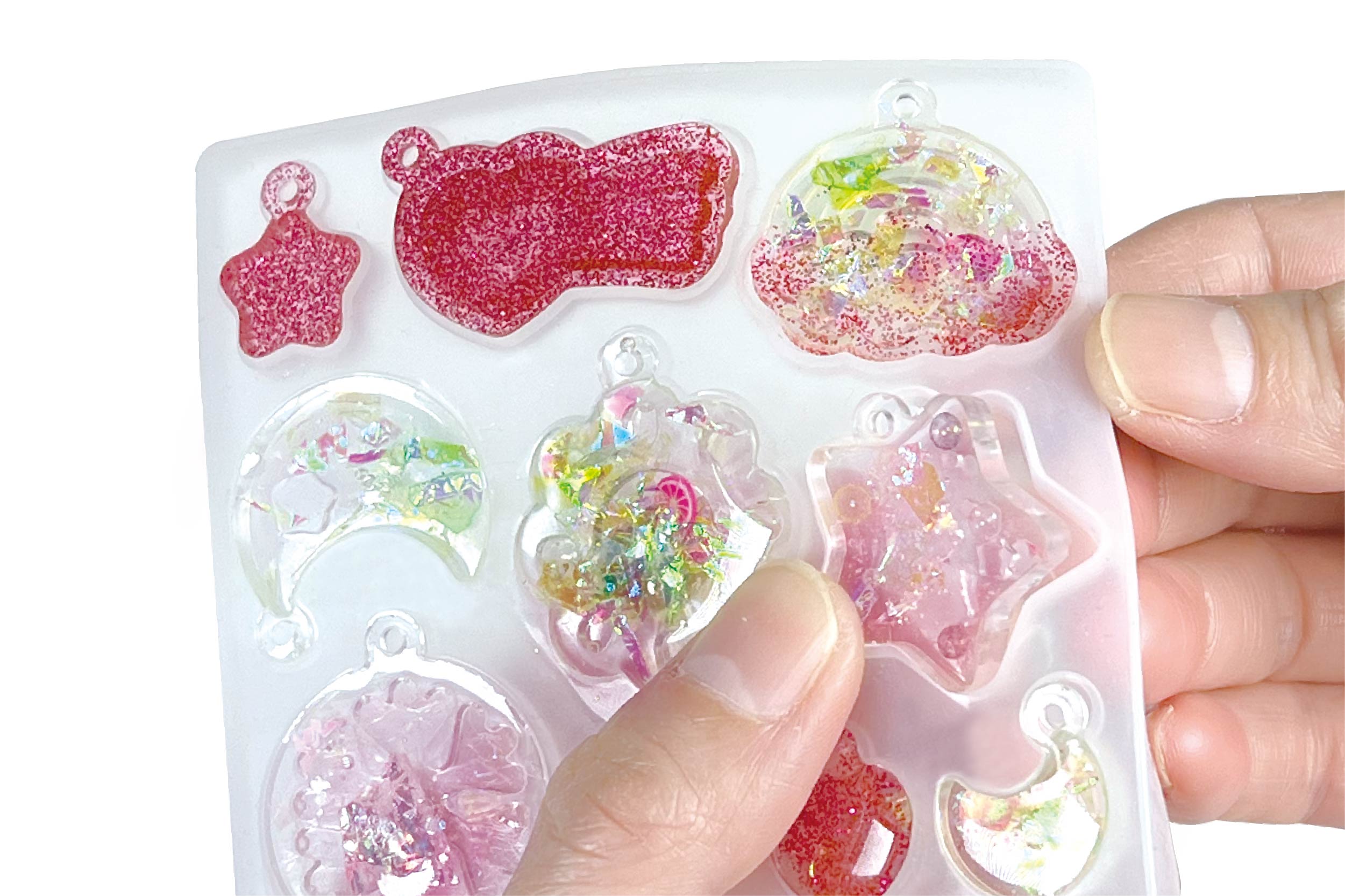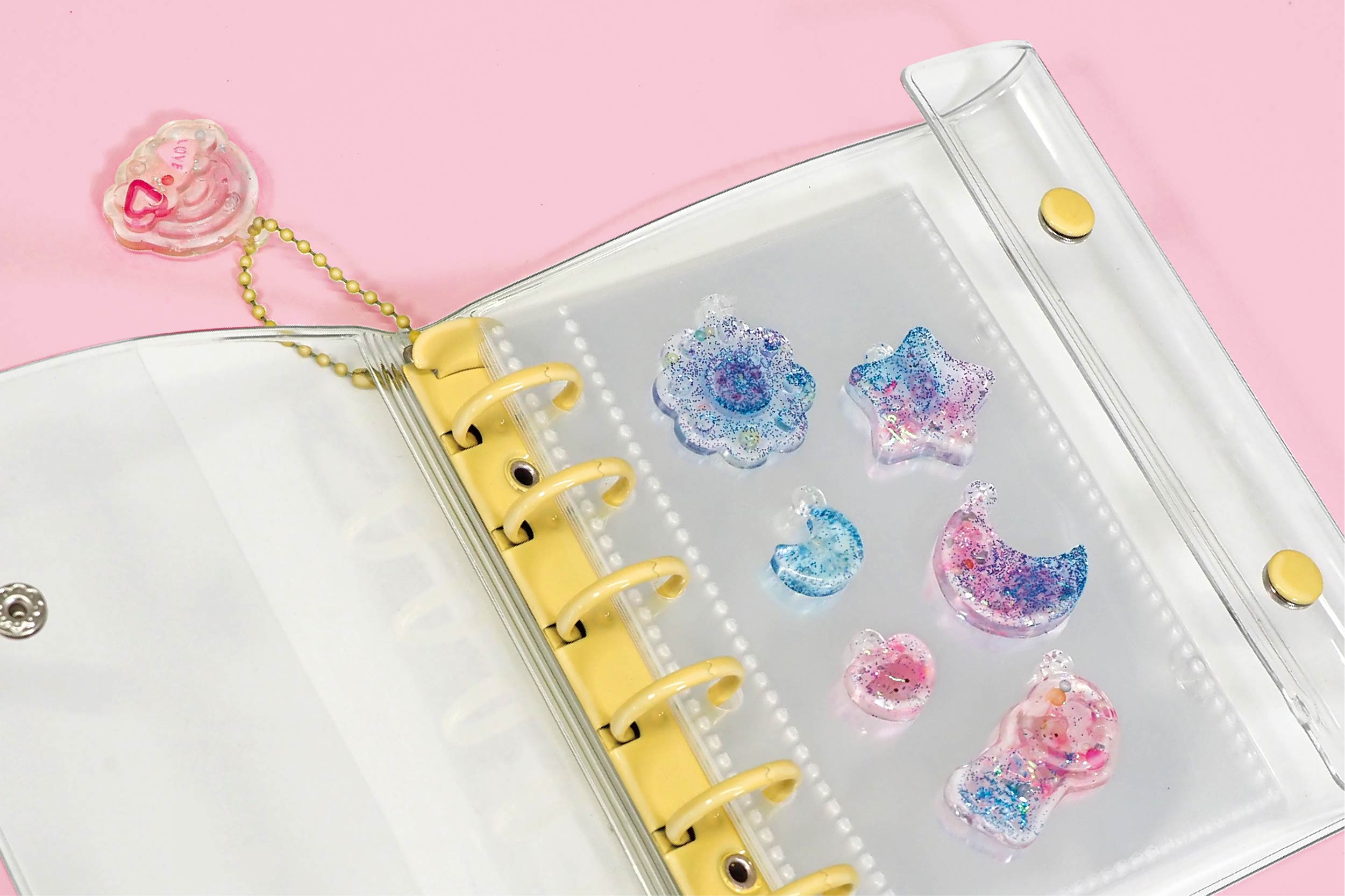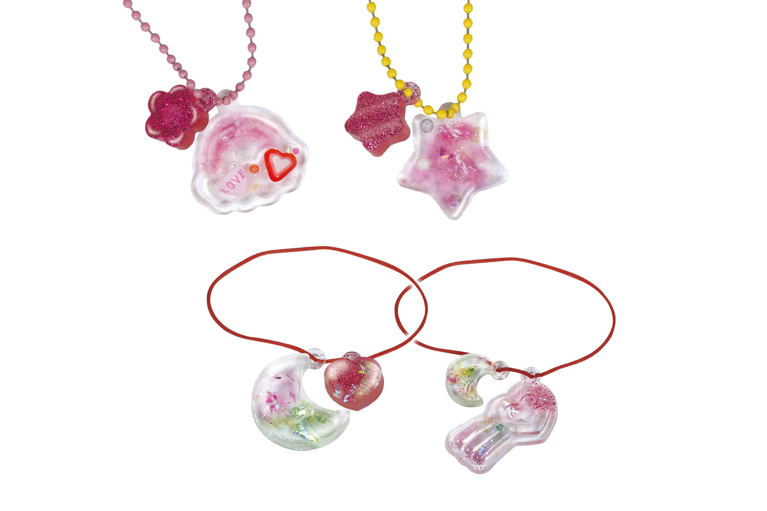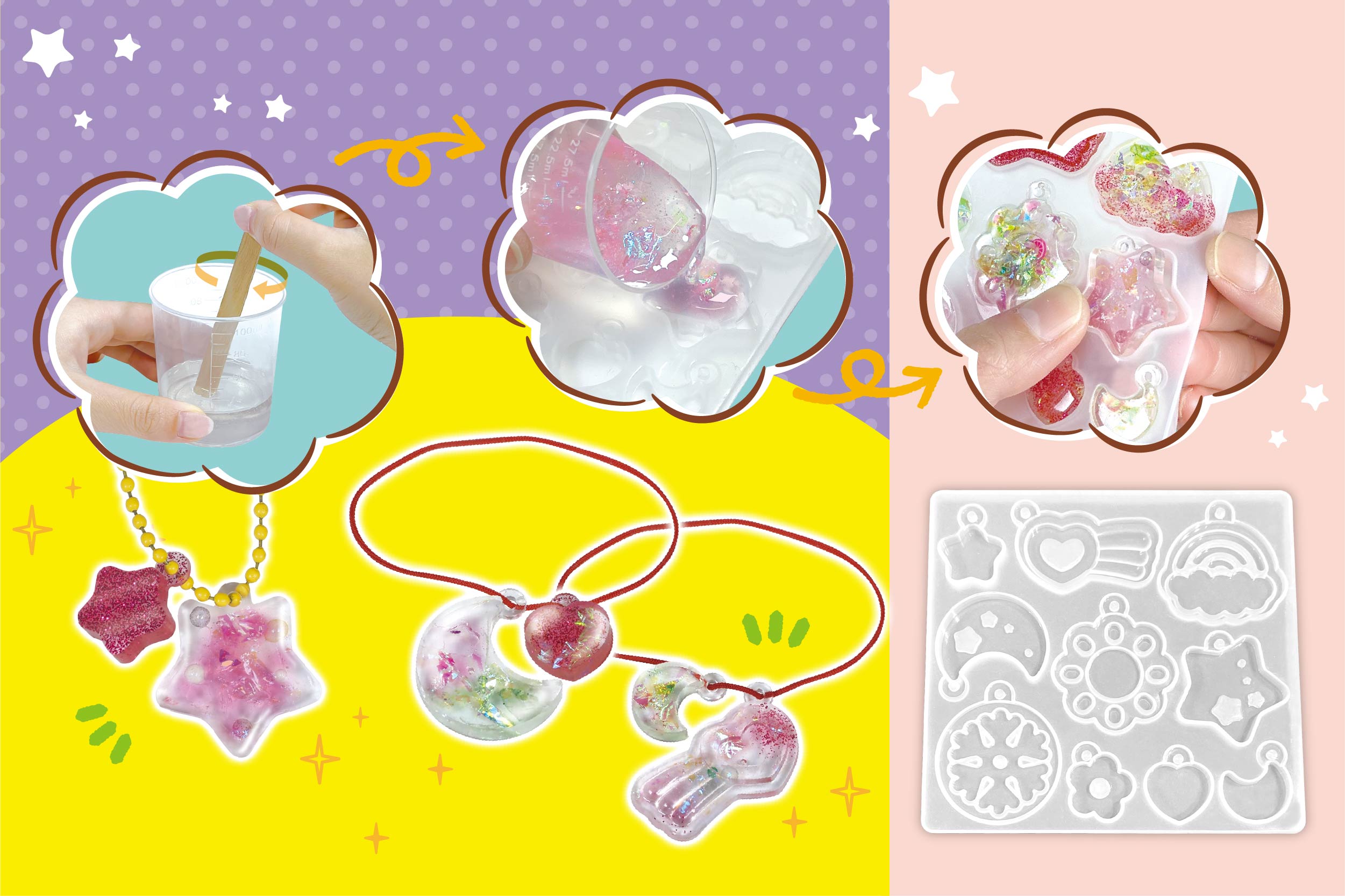 ストラップやブレスレットなどキラキラかわいいアレンジチャームを作ろう!両面テープを使ってシールにもアレンジできる!型やボールチェン、ラメなど、セットになってすぐ作れる嬉しい材料全部入り。2液タイプのエポキシレジンで固まるからUVライトや電子レンジなども不要でお子様でも簡単に作れます。