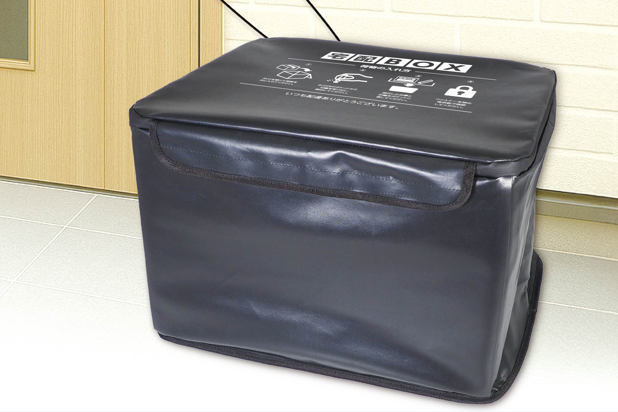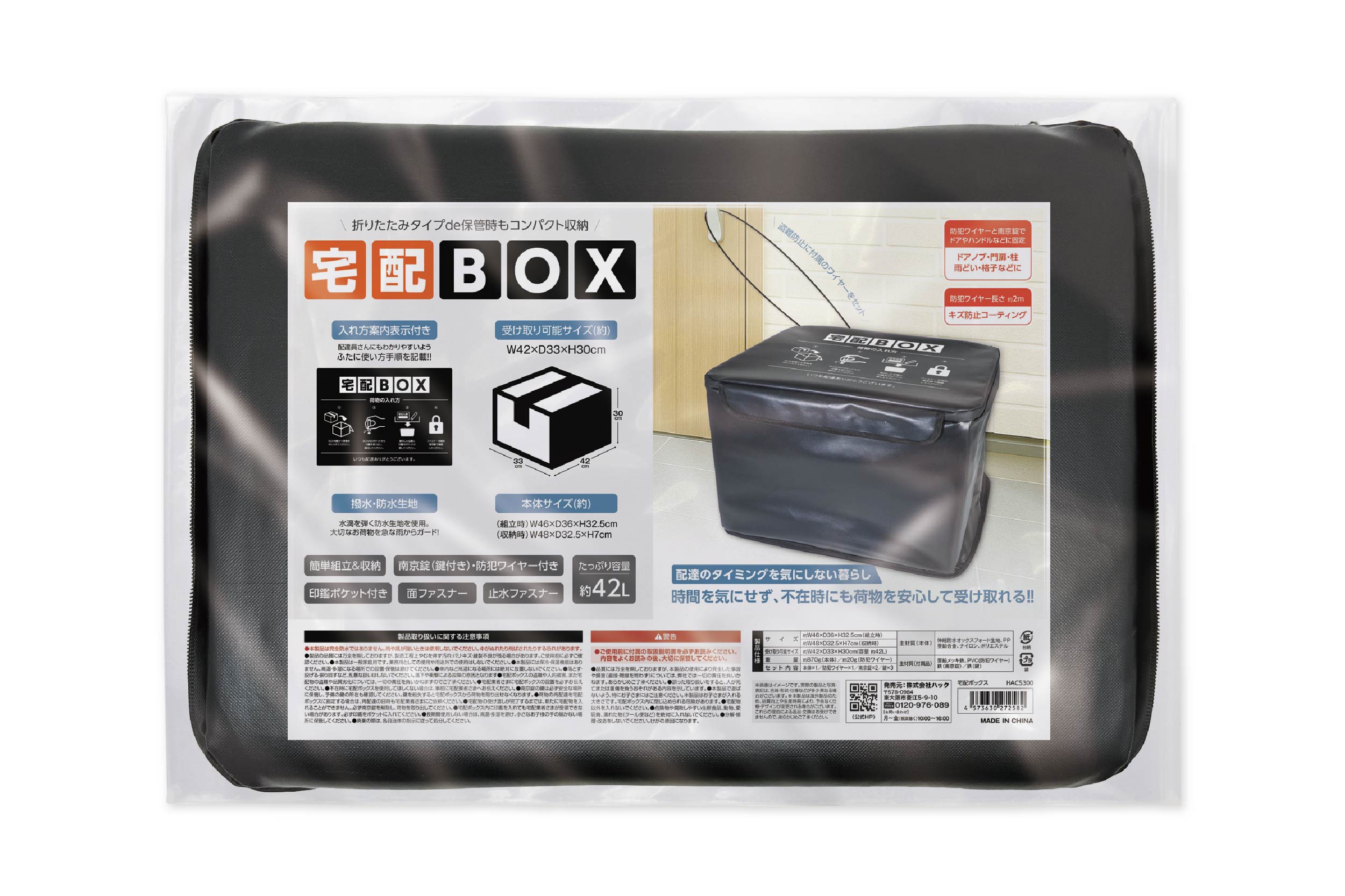 収納時もコンパクト!折りたたみタイプの宅配ボックスです。盗難防止にドアやハンドルなどに固定できる防犯ワイヤーと南京錠がセットになって安心して設置できます。配達員さんにもわかりやすいようにフタに使い方手順を記載!