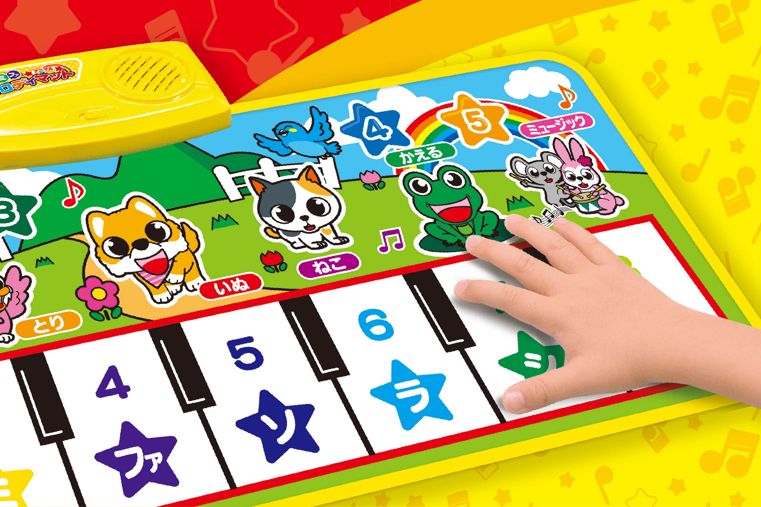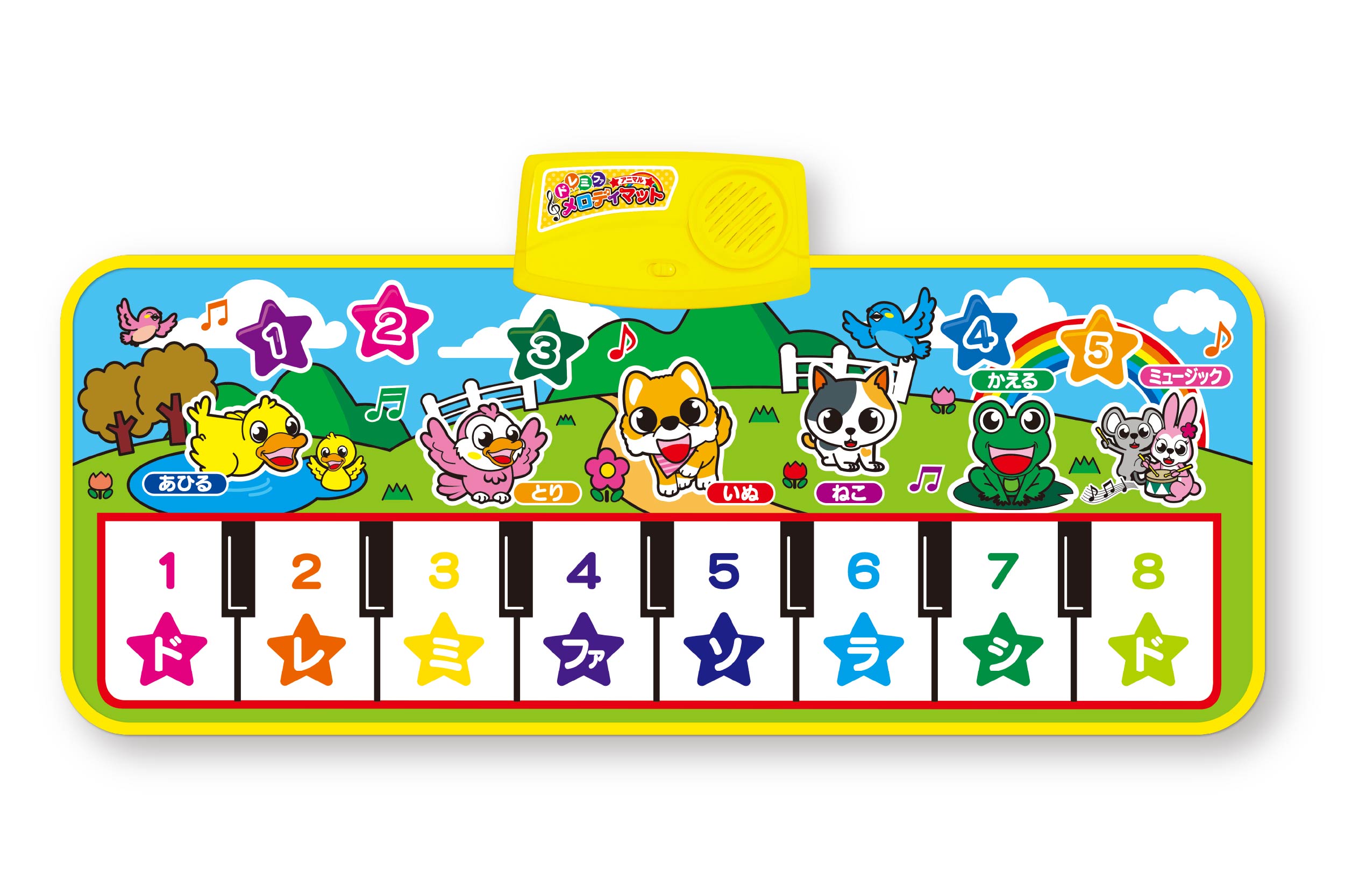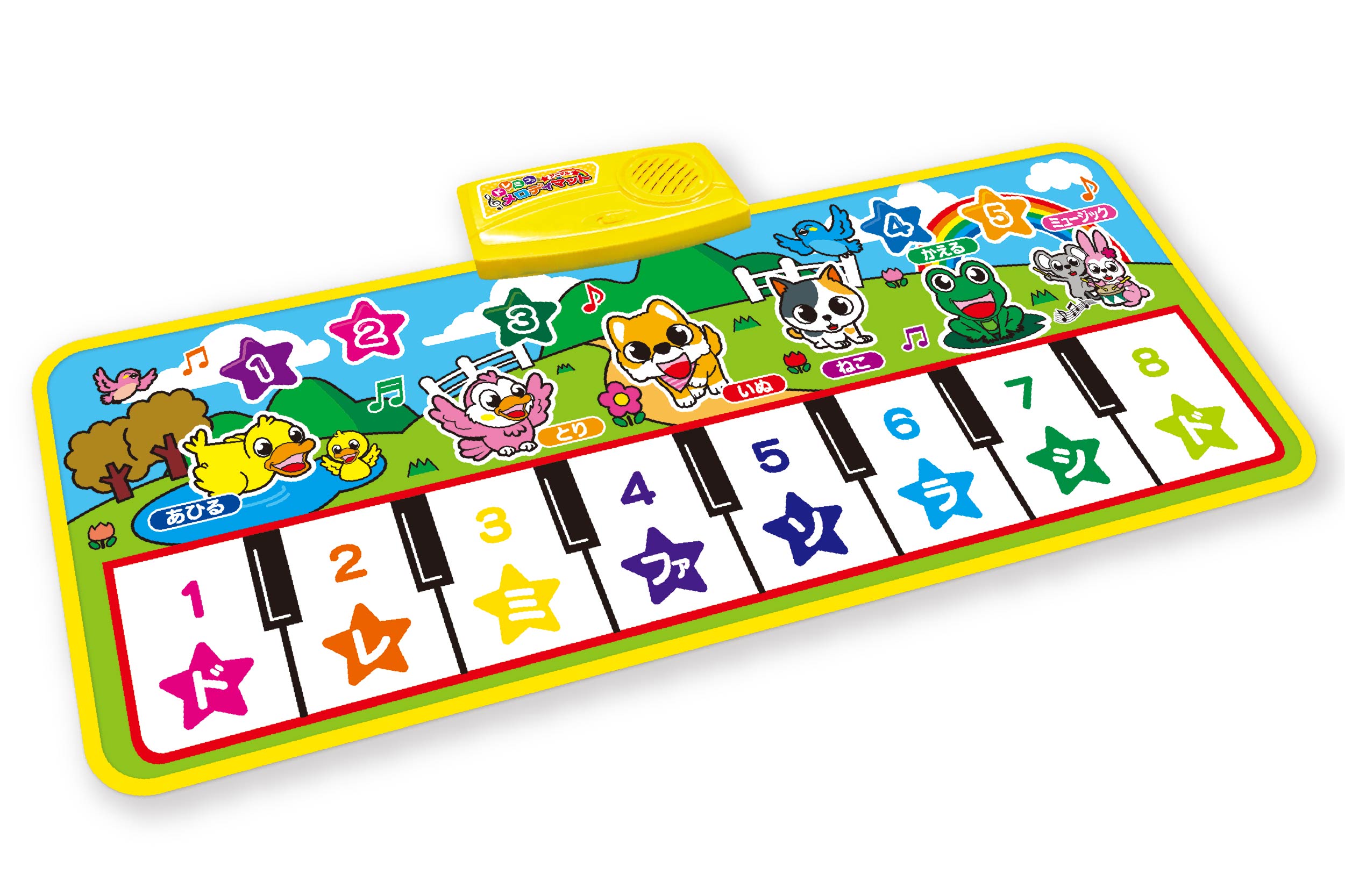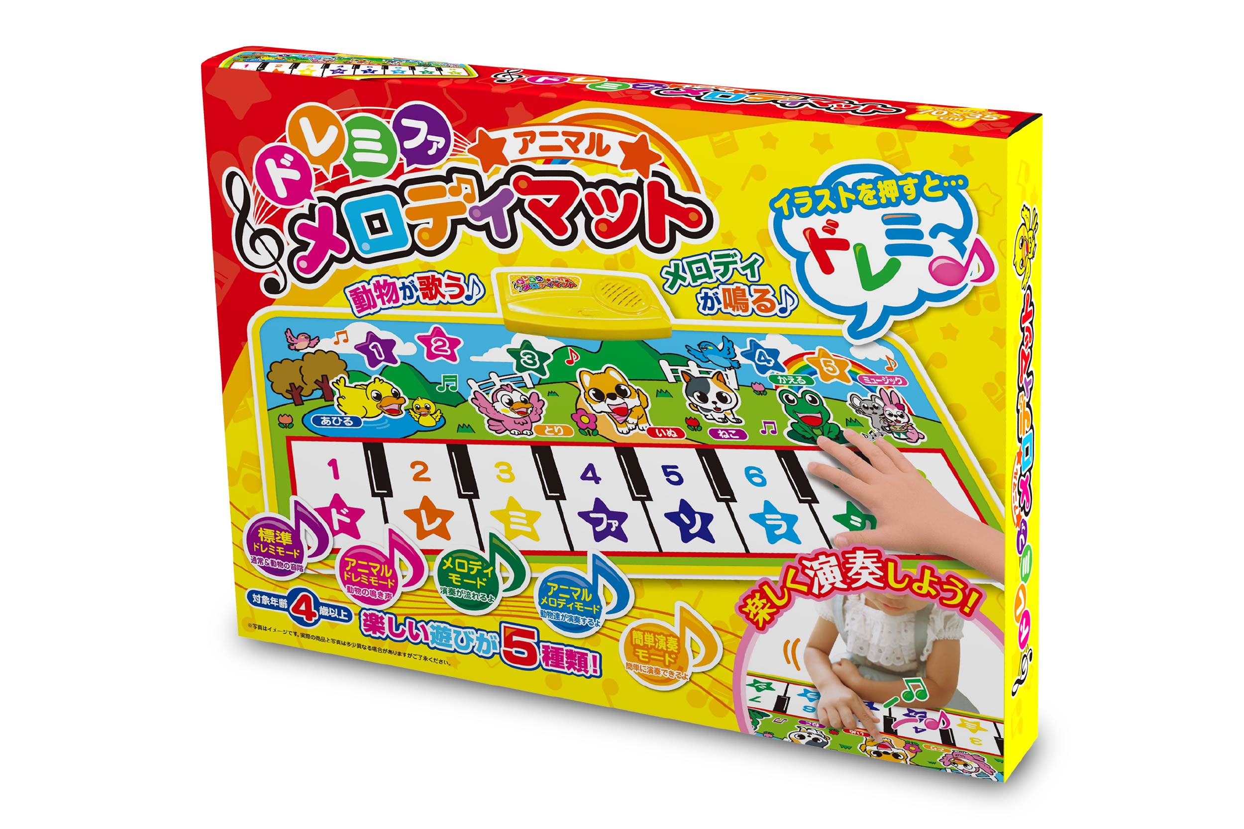 メロディが鳴る!動物が歌う!マット式で楽しく弾けるメロディマット。ドレミファを奏でる標準モードと、イラストをタッチすると動物が鳴くアニマルドレミモード。演奏が流れるメロディモードなど楽しい機能を5種類搭載。折りたたんでコンパクに収納できるのでお片づけ時もすっきり。