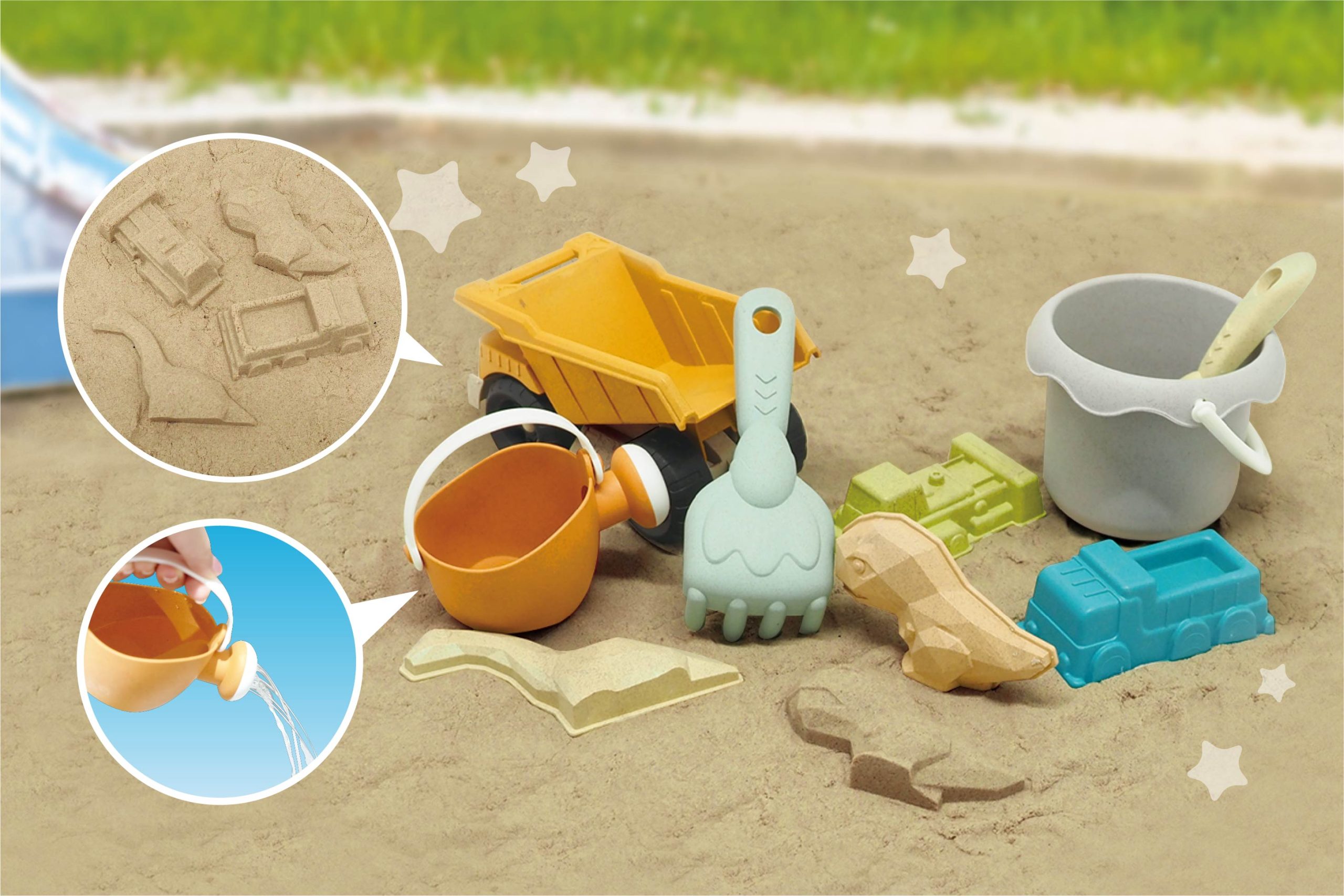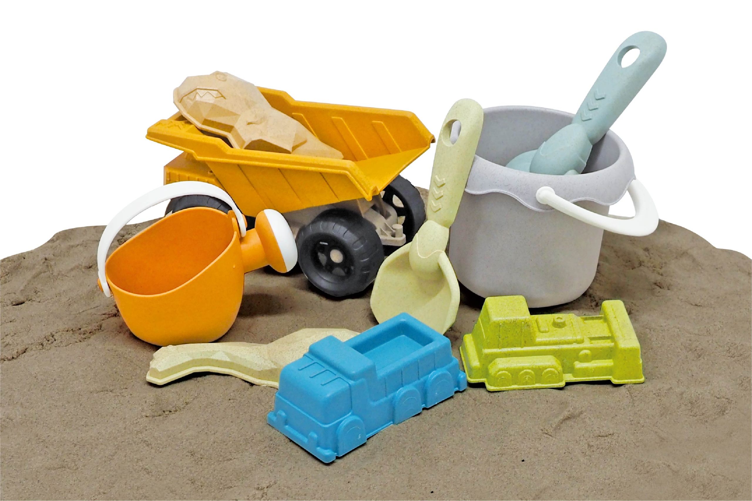 小麦由来の素材を一部使用した、環境にやさしいお砂遊びセット! 再生可能な原料のため、二酸化炭素の排出を抑えることができる「部分的バイオマス原料プラスチック」を使用しています。柔らかい素材で小さなお子さまにも安心してお使いいただけます♪