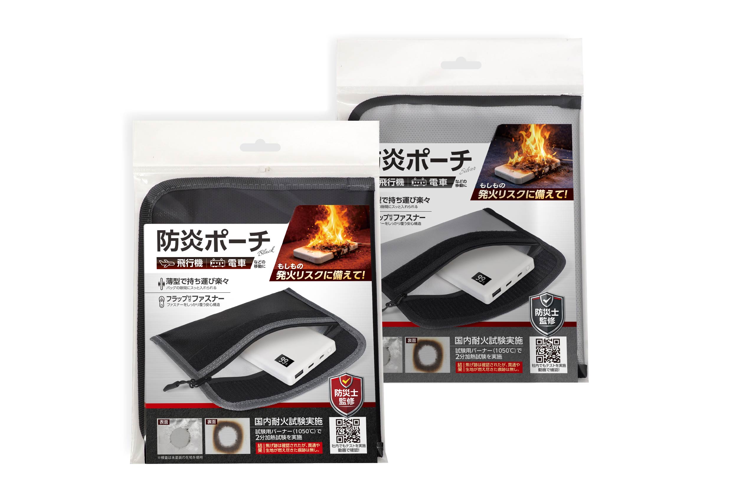 飛行機や電車、もしもの時の発火リスク対策に!モバイルバッテリーなどの電子機器の炎上を最小限に抑える防炎ポーチです。お洒落なブラックカラーで、ファッション性も抜群。1,000℃のバーナーで2分間加熱する国内耐火テストを実施。ポーチの素材には、耐火性が高く特殊加工された「ガラス繊維布(グラスファイバークロス)」を2重構造で使用しています。