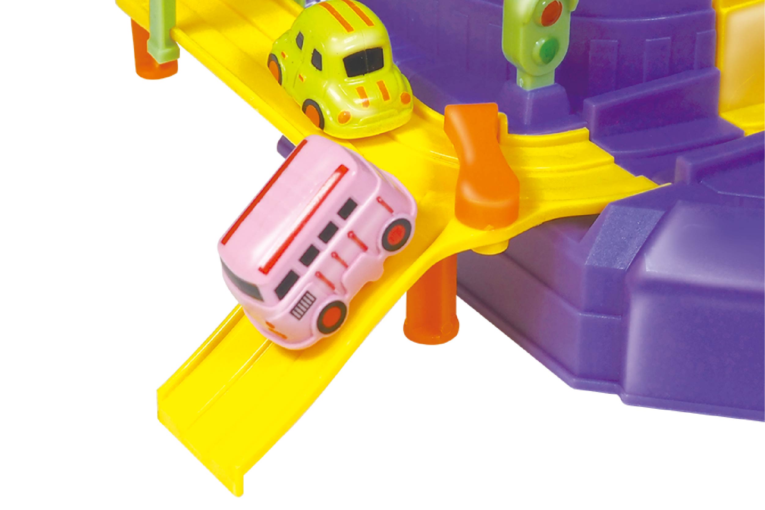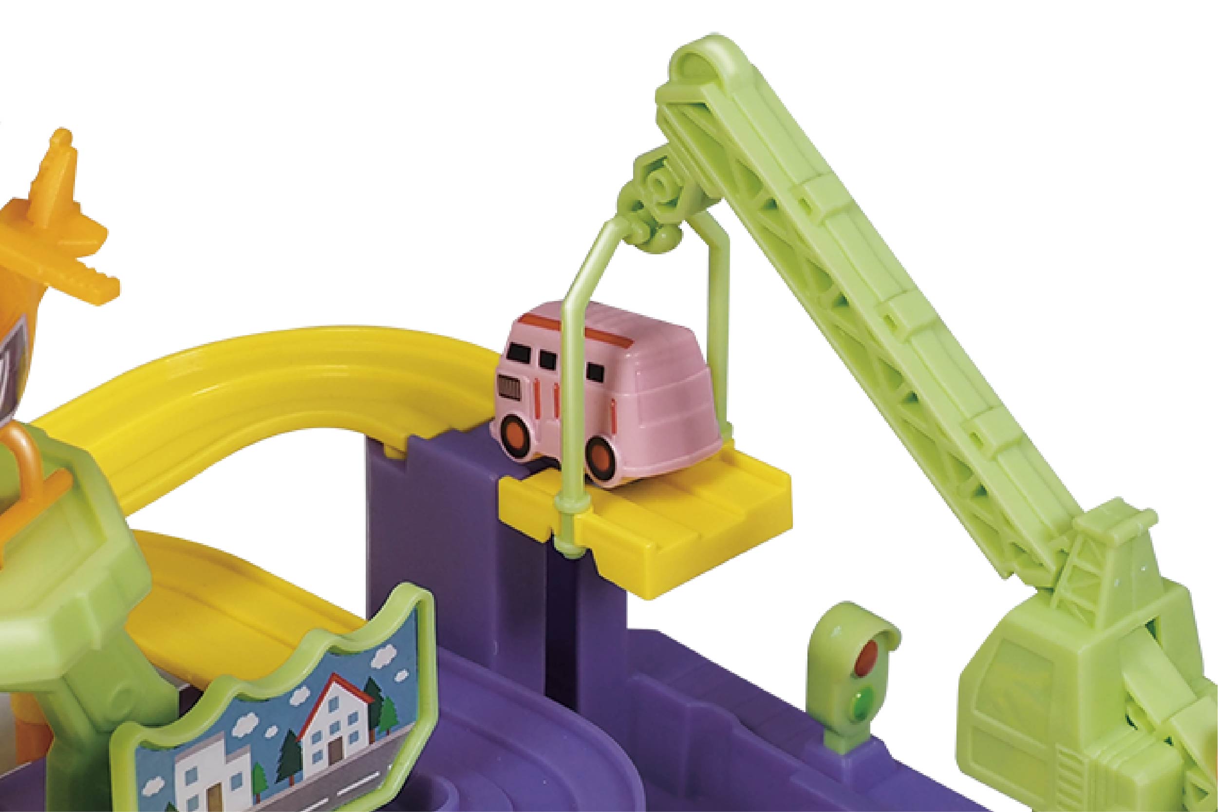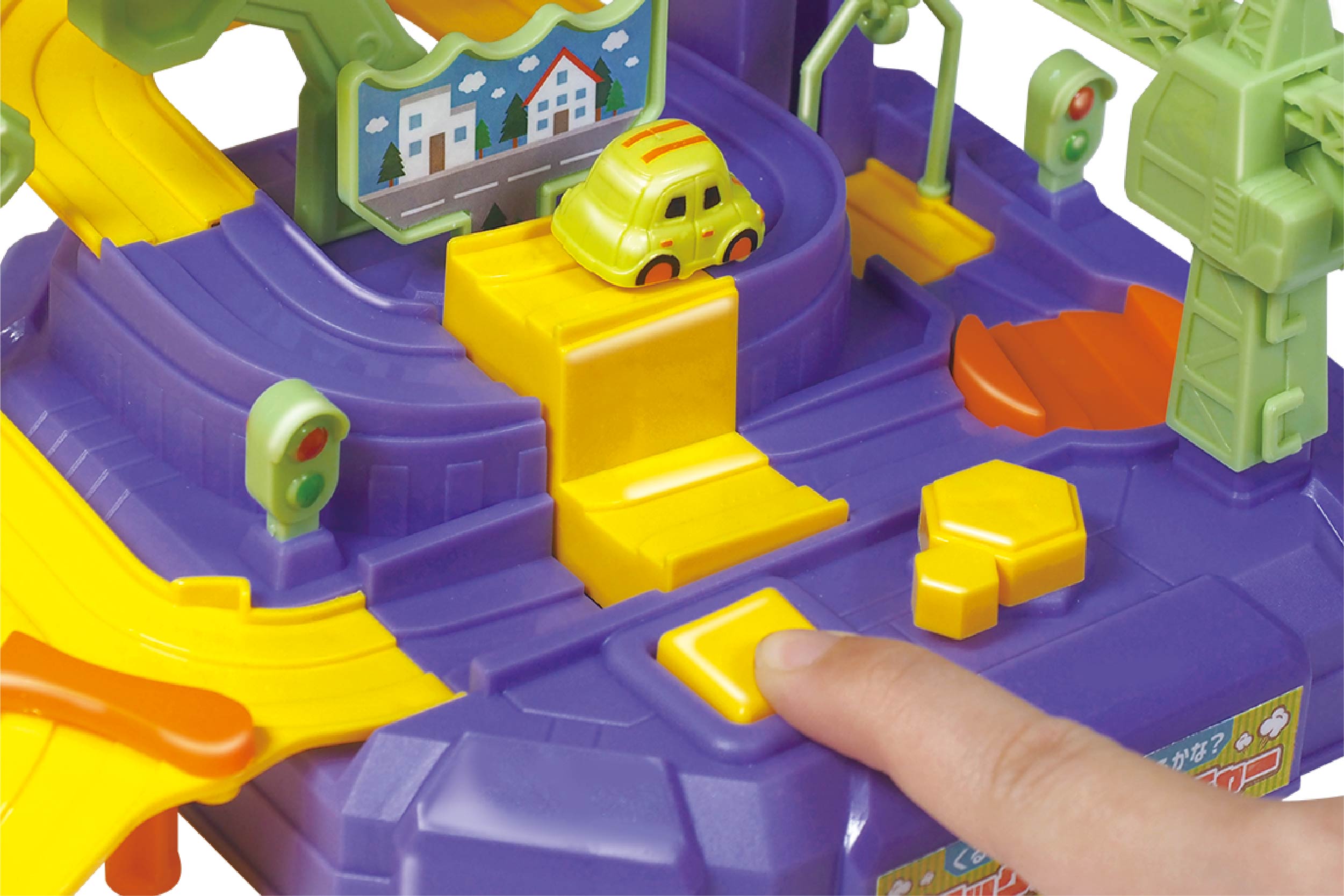 ボタンを押したり回したりするとガタン!ゴトン!とコースが動いてくるまが進む!ギミックを上手に動かしてうまく、くるまを走らせよう。電池不要ですぐ遊べるから夢中になっても大丈夫。慣れてきたら2台のくるまをスムーズに動かせるように練習してみよう!