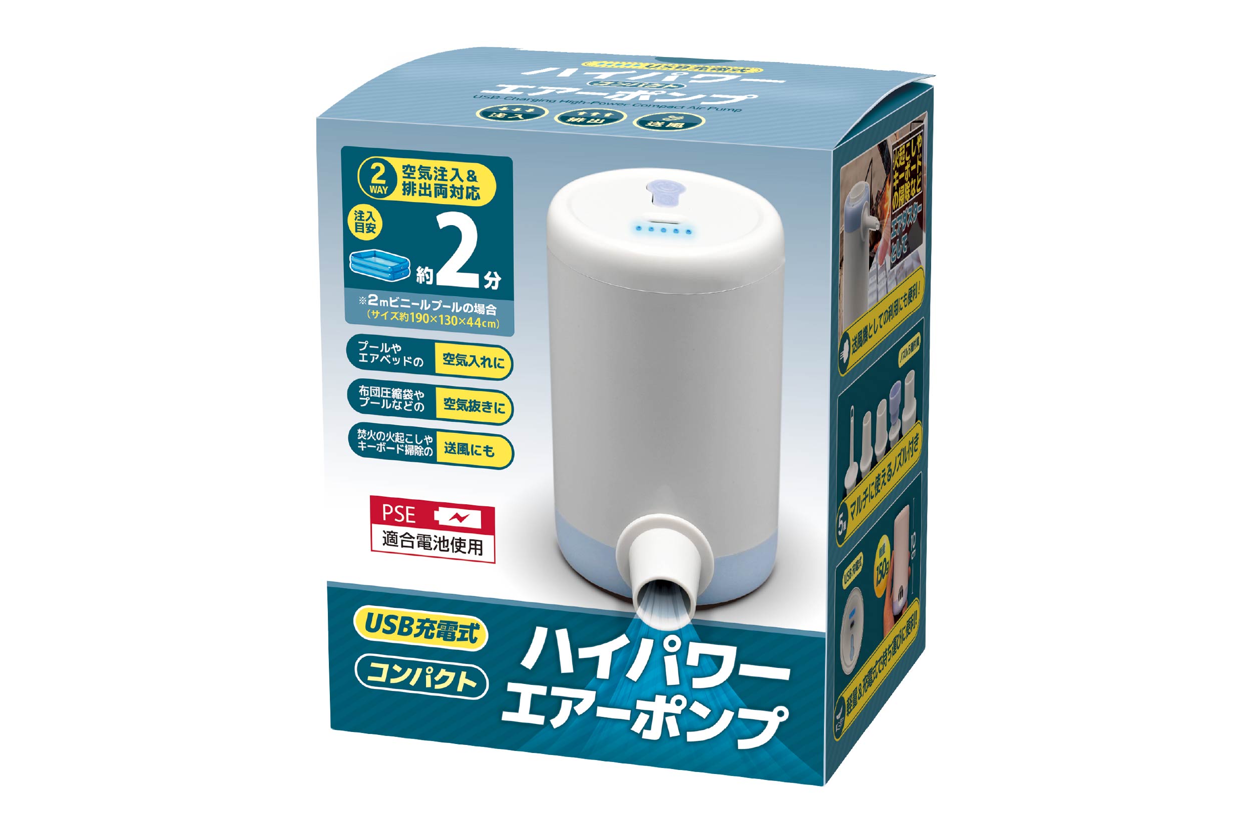 USB充電式で手軽に使えるコンパクトエアーポンプ。小型なのに超ハイパワーで、2mの大きなプールも約2分で膨らみます!排出もできるので衣類や布団の圧縮袋・プールの空気抜きにも最適です。マルチに使えるノズルも5種類付き!軽量&充電式で持ち運びしやすく、アウトドアやレジャーにもとっても便利!
