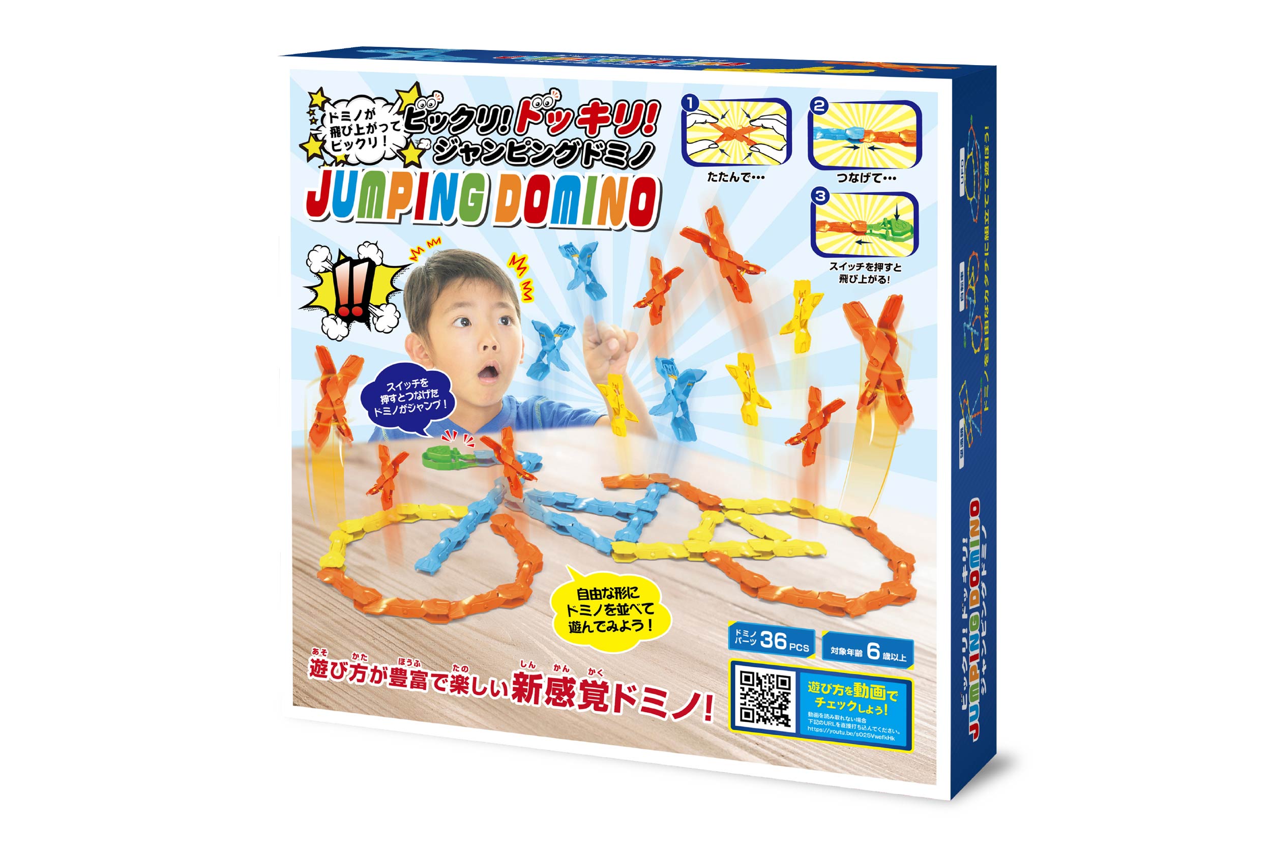 動画で大バズりした、あのジャンピングドミノがついに登場!遊び方はカンタン!ドミノパーツをたたんで、つなげて、スイッチボタンを押すと…ドミノがパーンとはじけ飛ぶ!!Youtubeで100万回再生された、新感覚の令和版ドミノです!