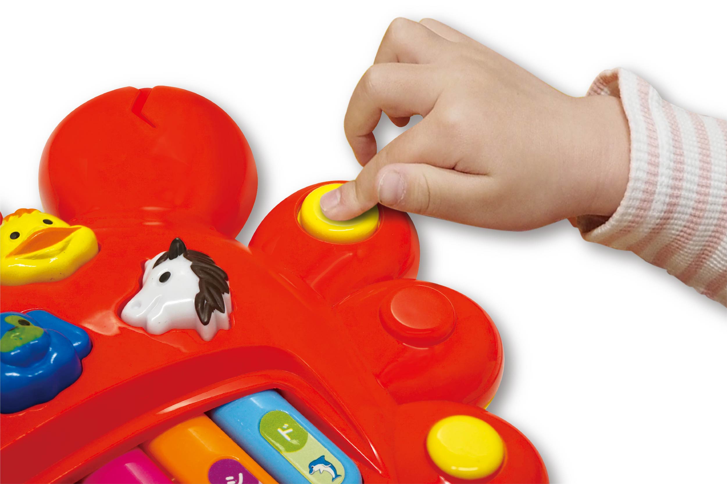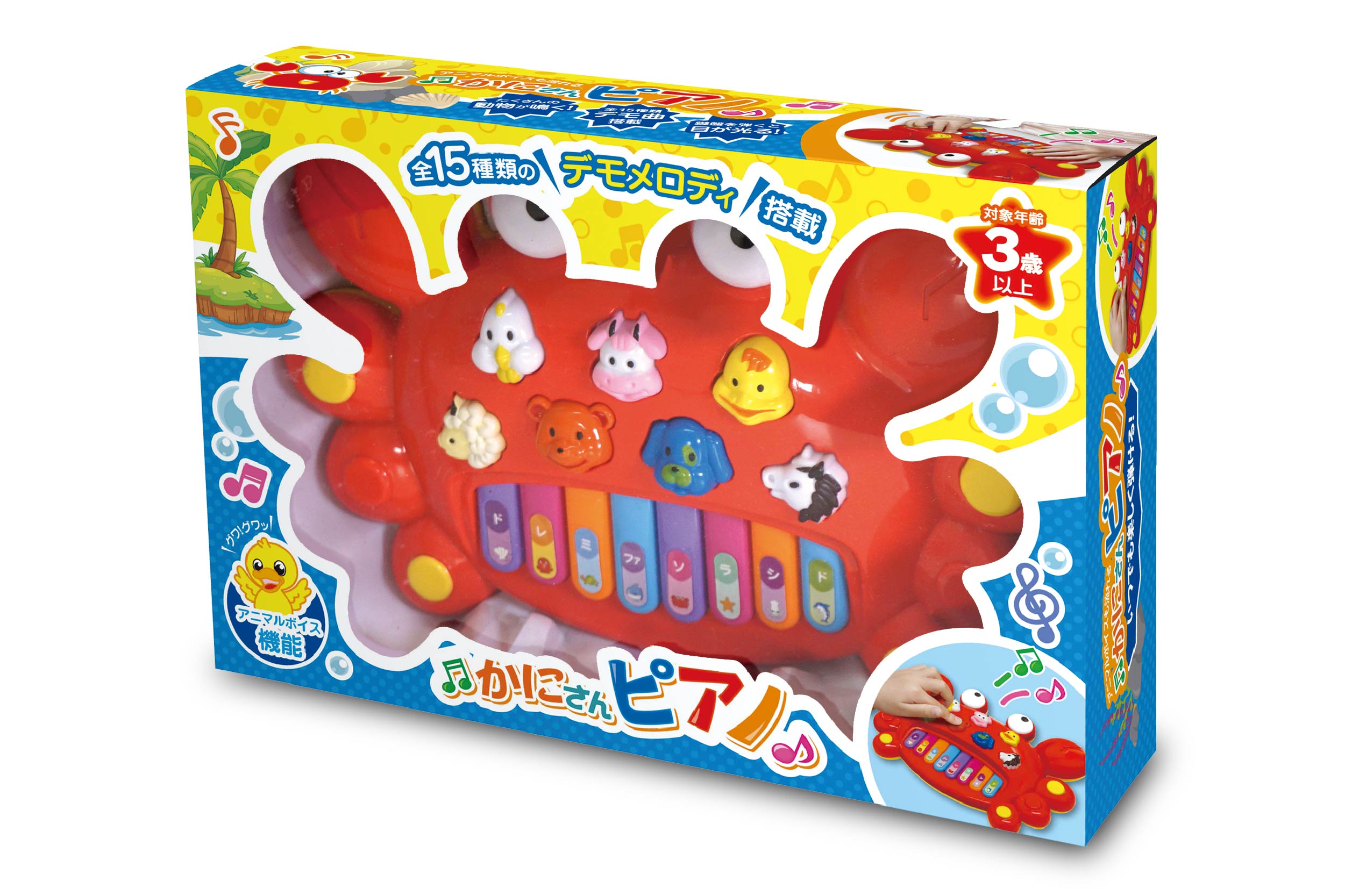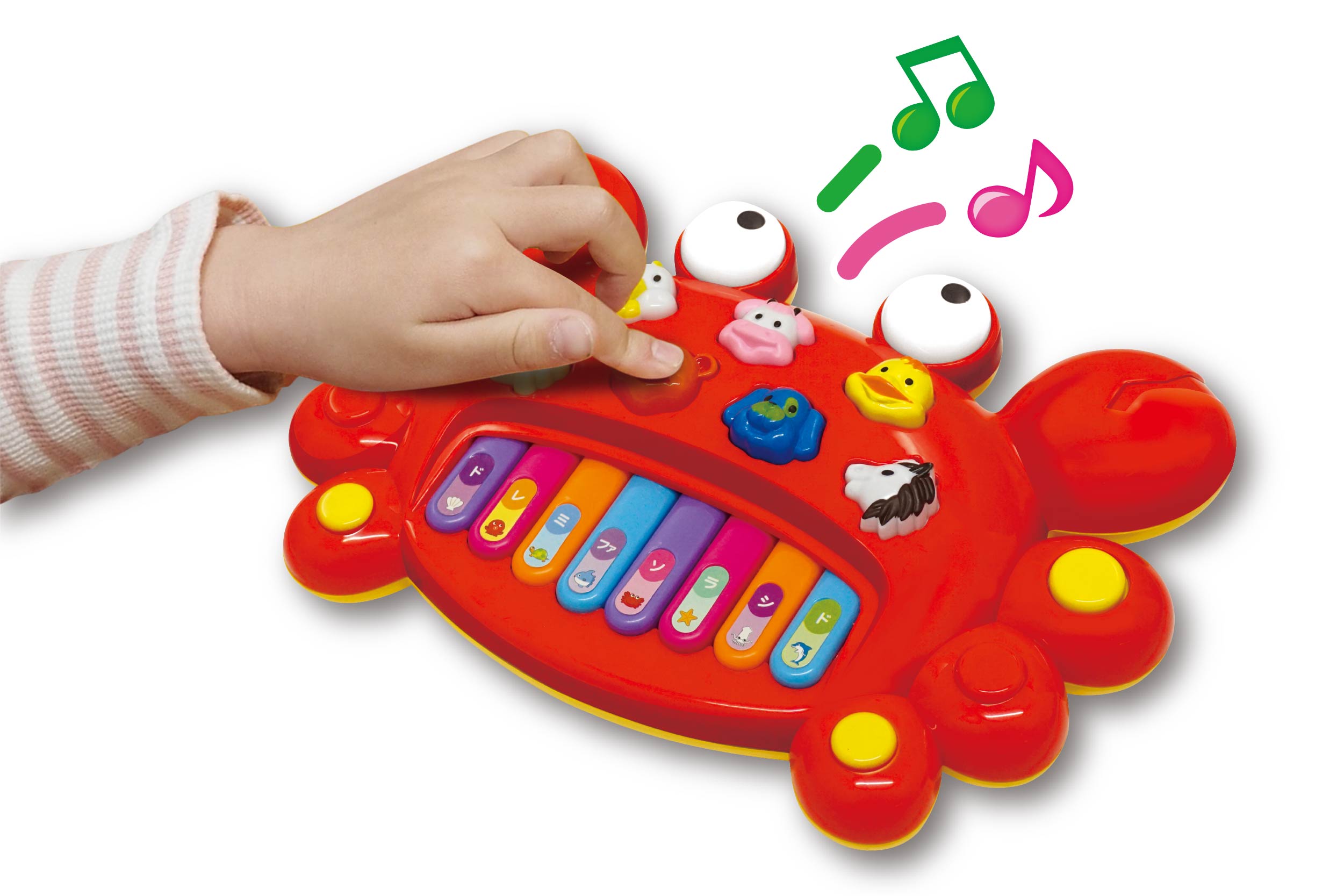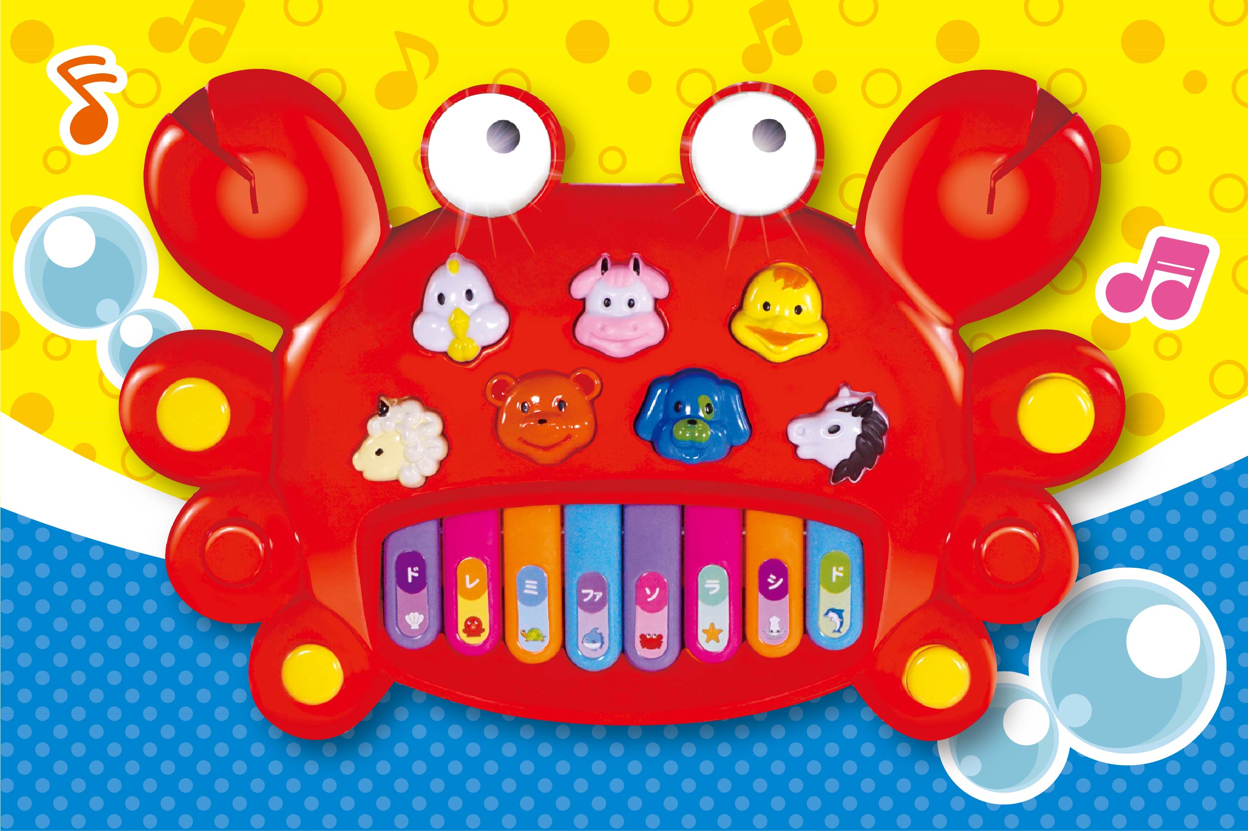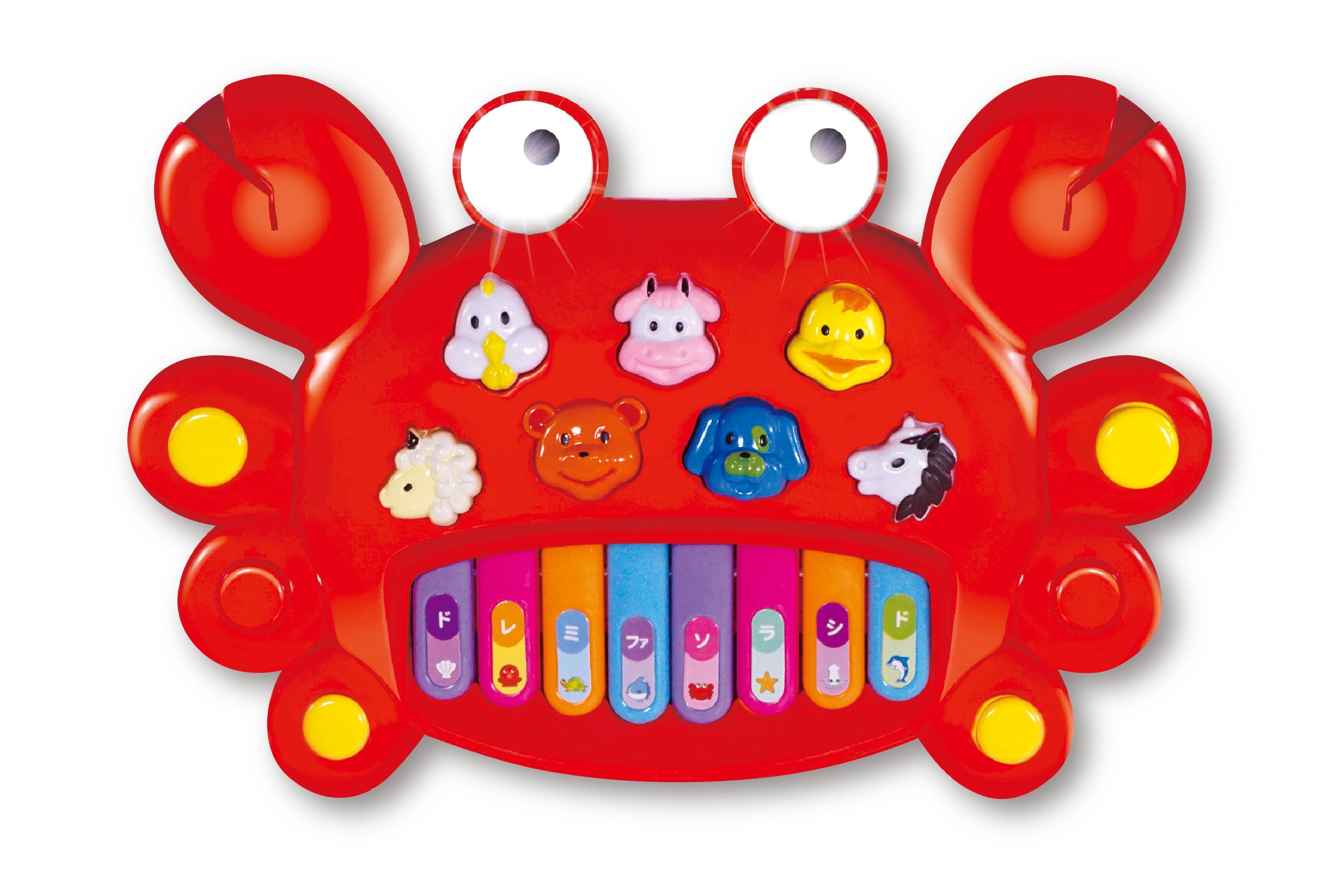 かにさんのシルエットをしたピアノで、ボタンと鍵盤を押すと目が光る!羊や牛、ヒヨコなどの動物が鳴くアニマルボイス機能や、15種類のデモメロディなど楽しい機能を搭載。小さな子供でも楽しく演奏することができます。