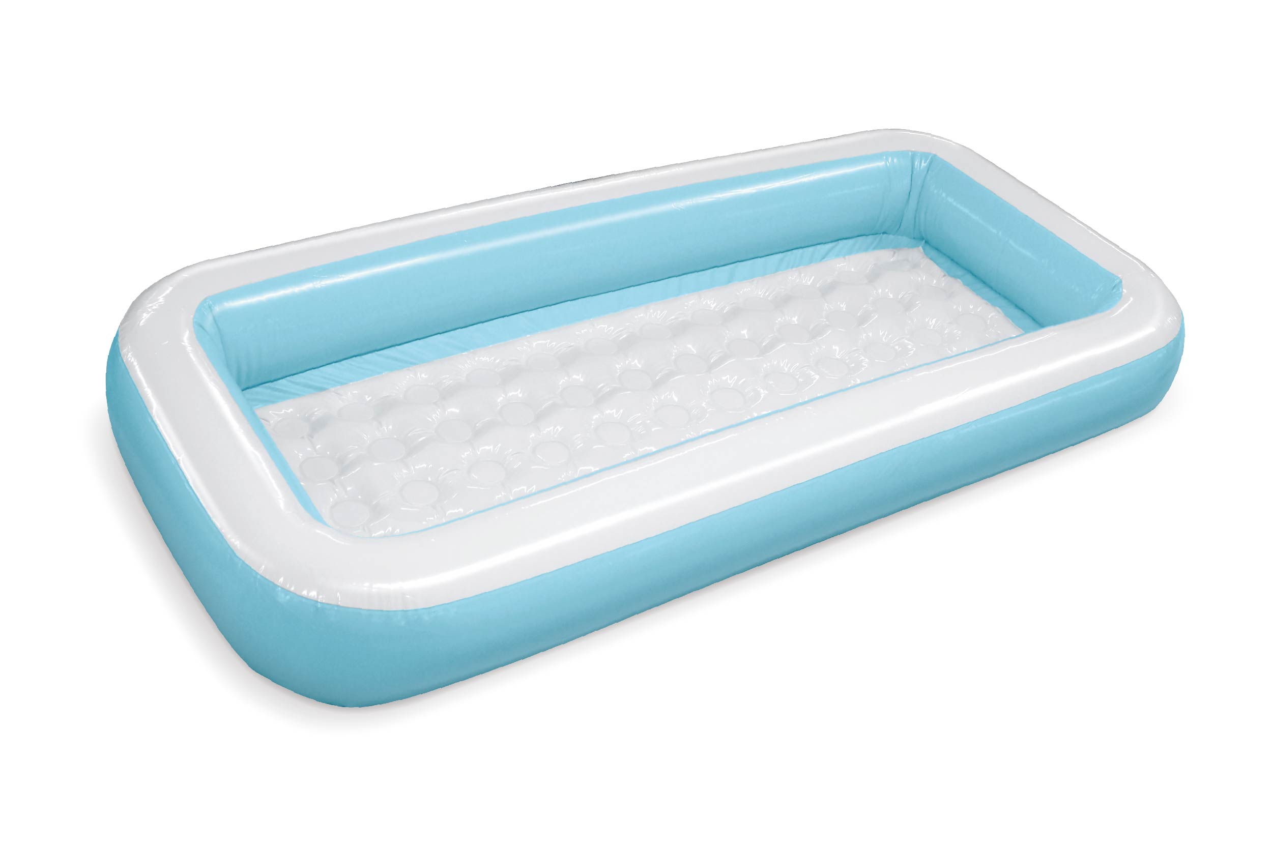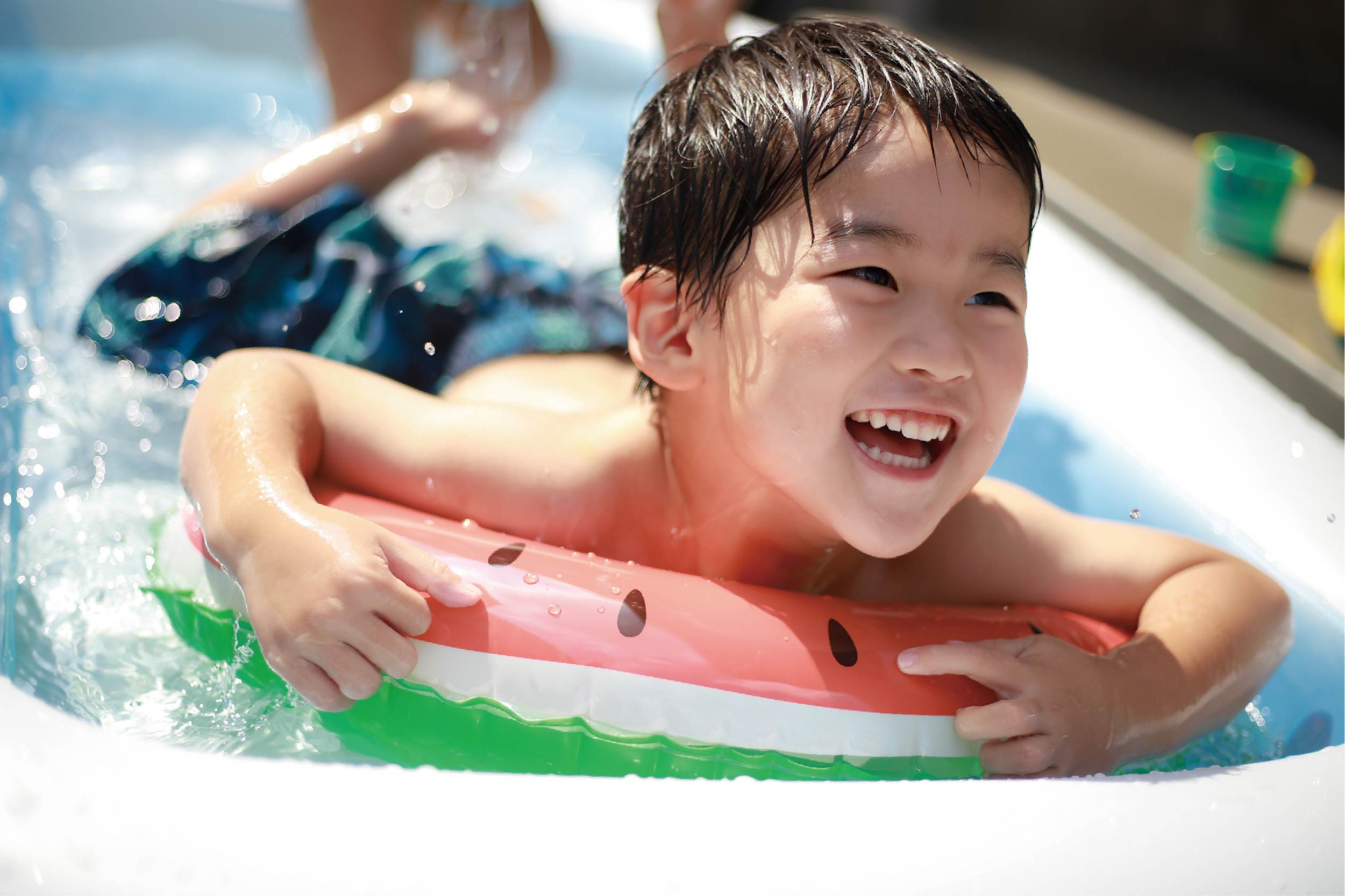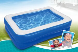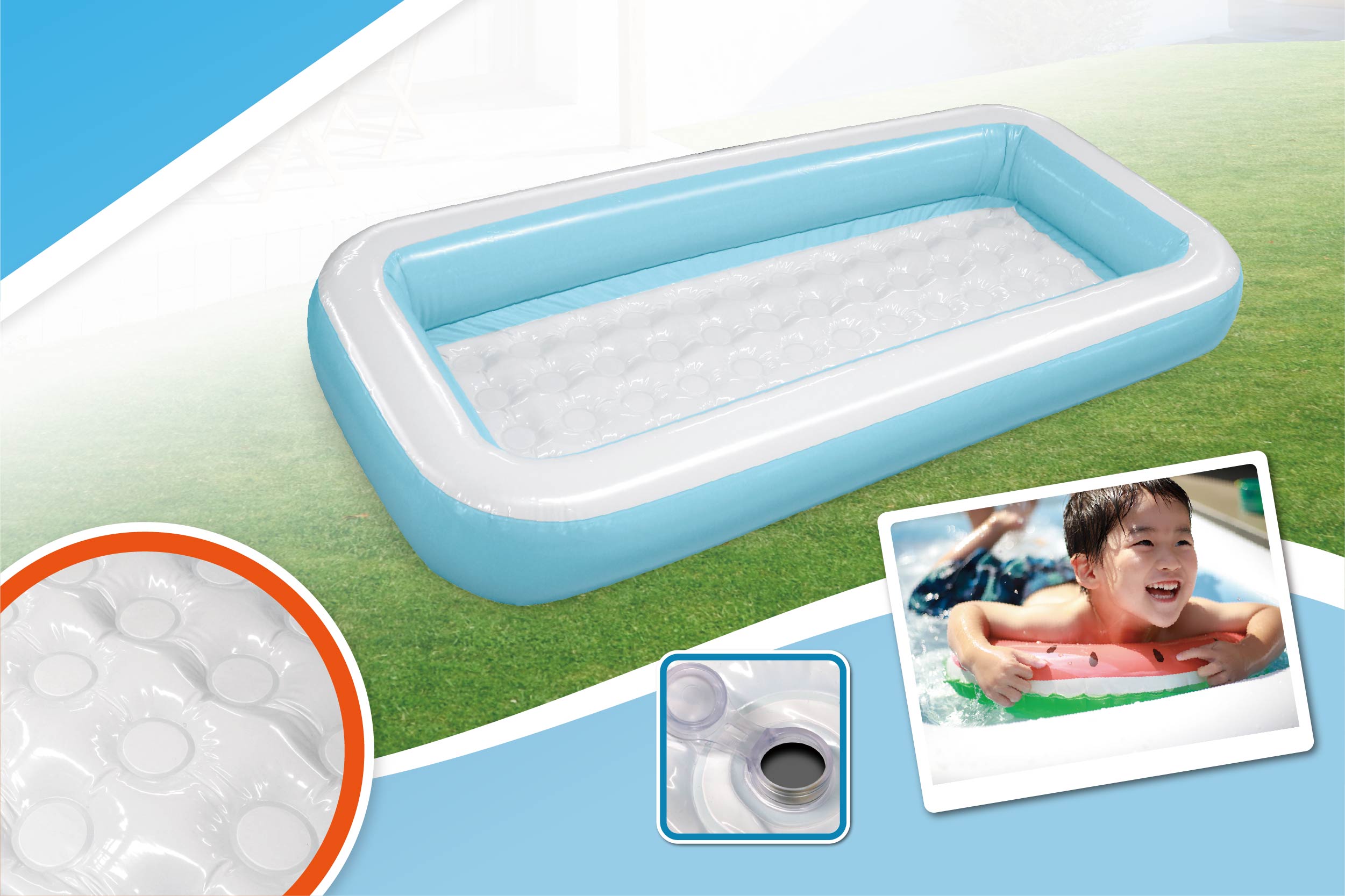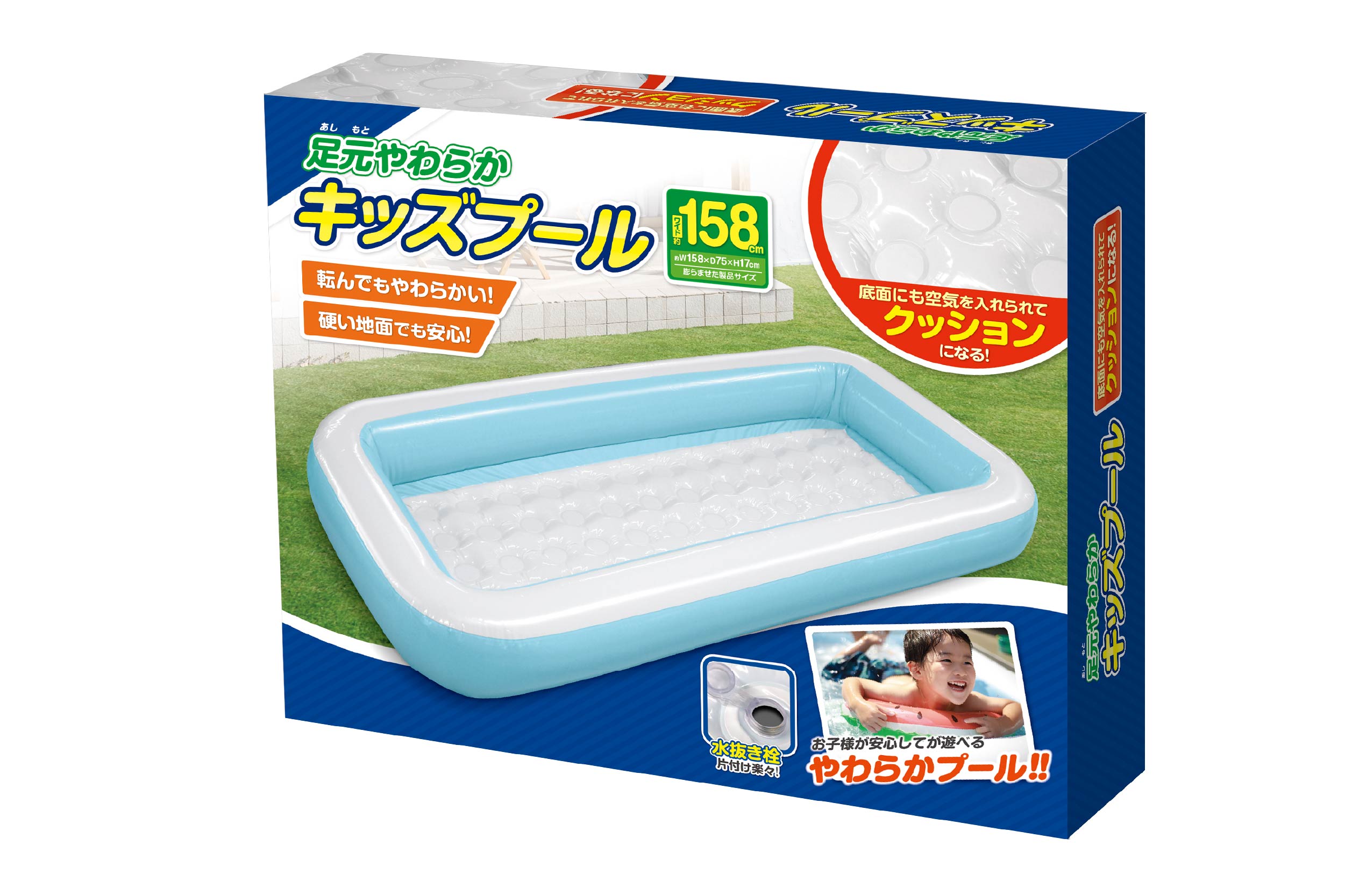 コンクリートの上でも安心の足元やわらかプールです!底面にも空気を入れられてクッションになり、転んでも柔らかく硬い地面でも安心です。最長158cmのビッグサイズのキッズプール。お庭にプールを置いて水遊びを楽しもう♪