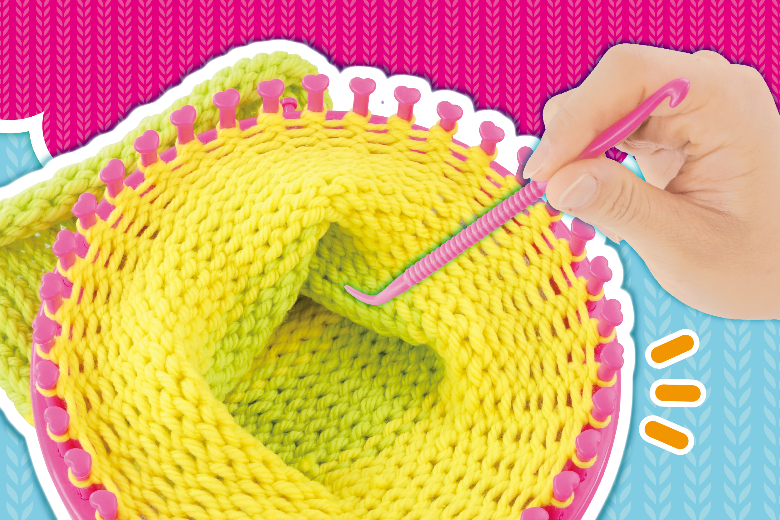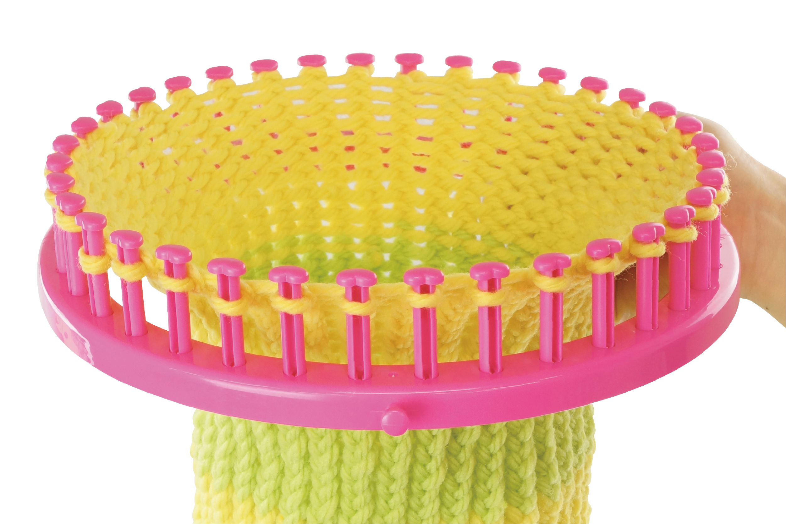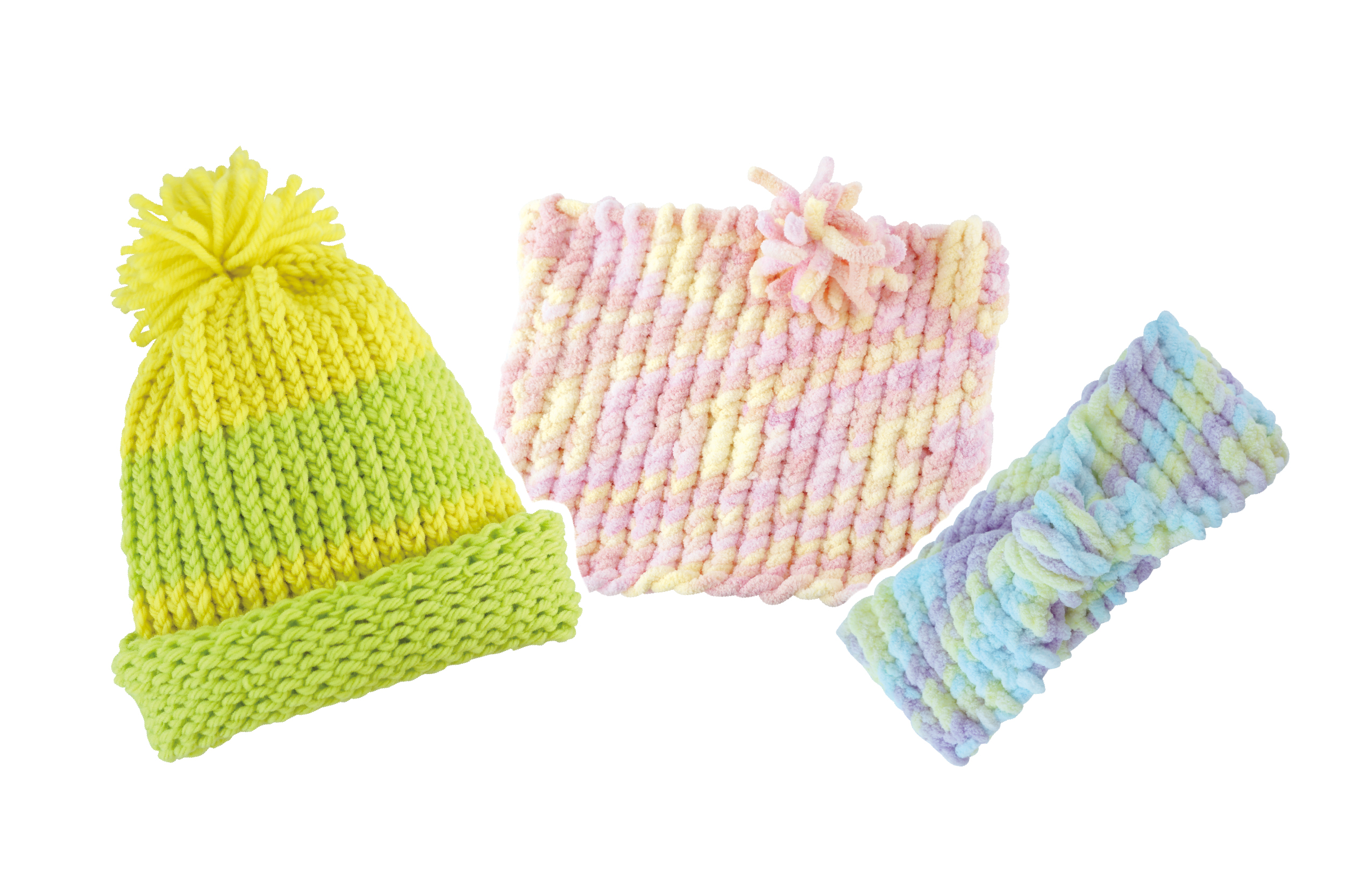 おうちで簡単に編みものが楽しめるハンドメイドキット♪毛糸をルームのリングにクルクル巻いて編むだけ!!ボンボンニット帽・もこもこネックウォーマー・ニットターバンなど、もこもこ可愛い編みものが作れちゃう。カラフルな毛糸3色が付属、自分だけのカラフルでオシャレな編みものを作ってみよう♪