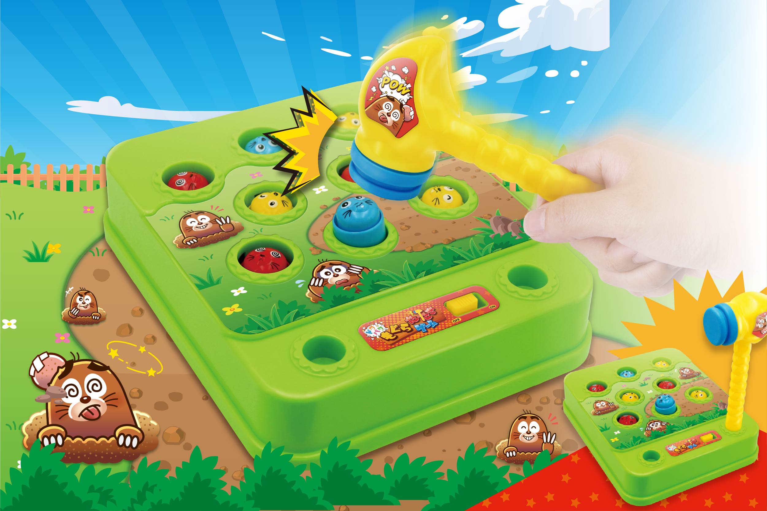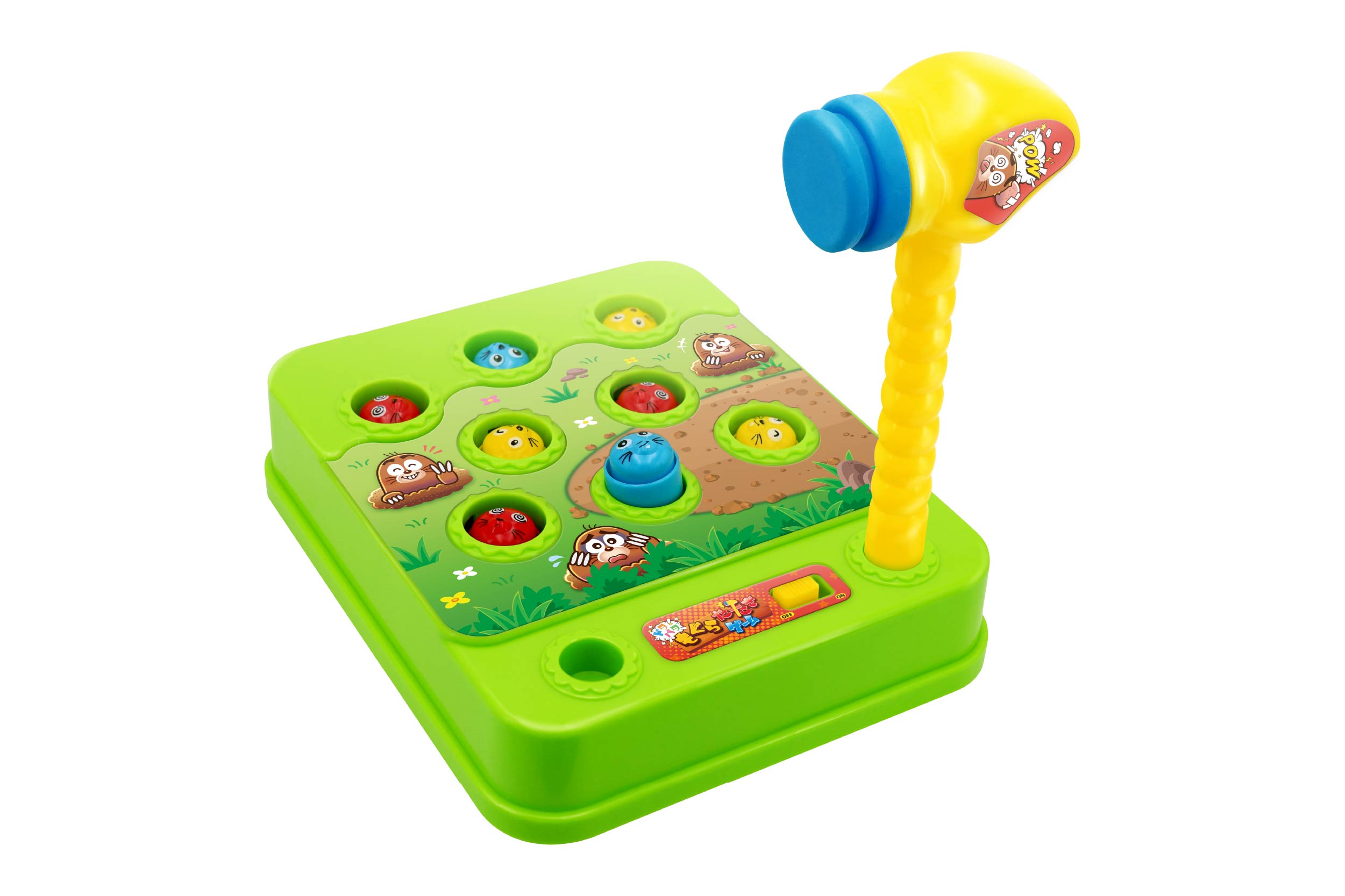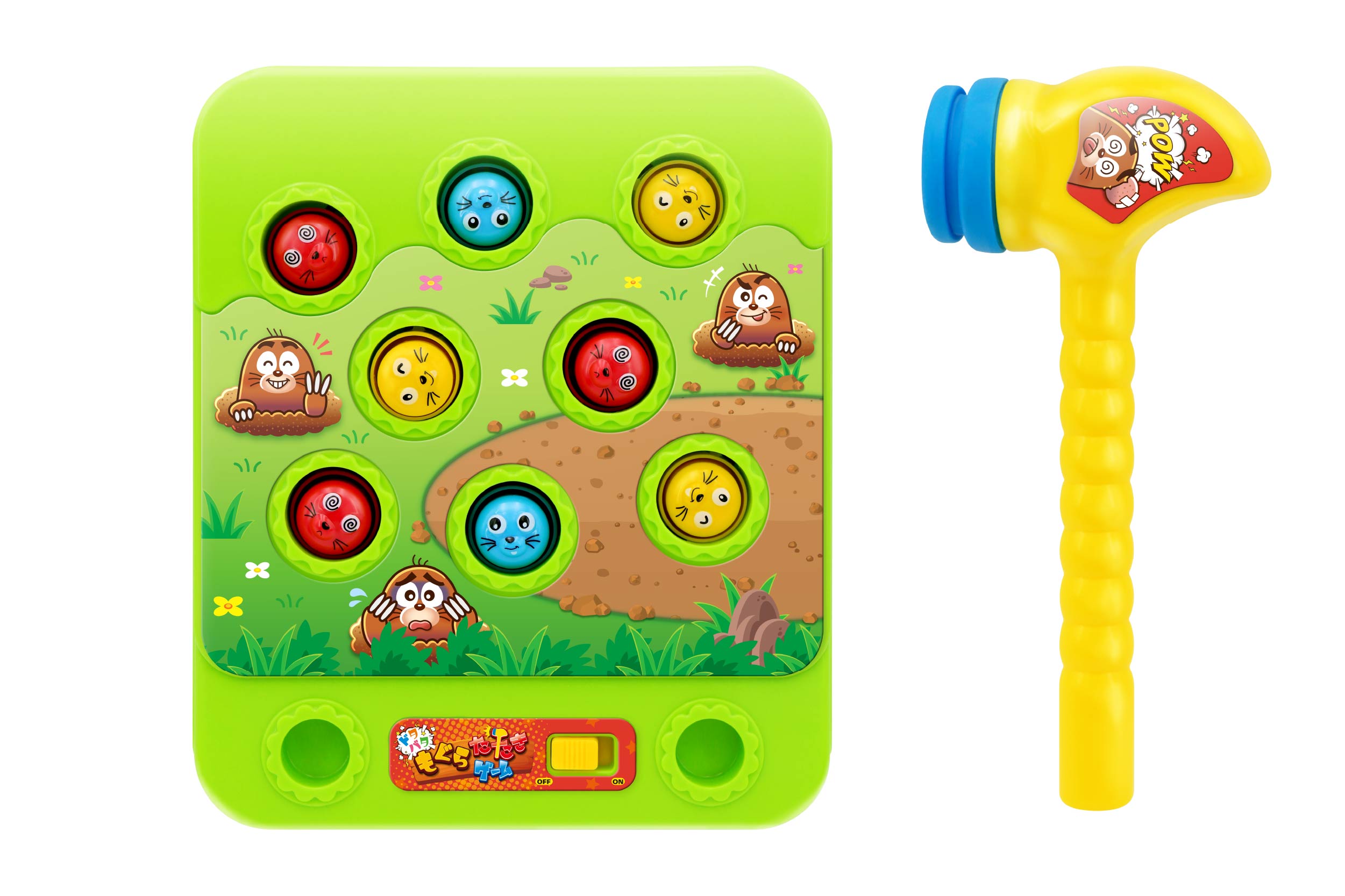 アミューズメントゲームの人気ゲーム「もぐらたたき」がお家で楽しめる!ひょっこり出てくるもぐらを、素早くハンマーでたたこう!タイミングよくたたくと音が鳴るよ♪穴から飛び出たもぐらを見逃すな!!