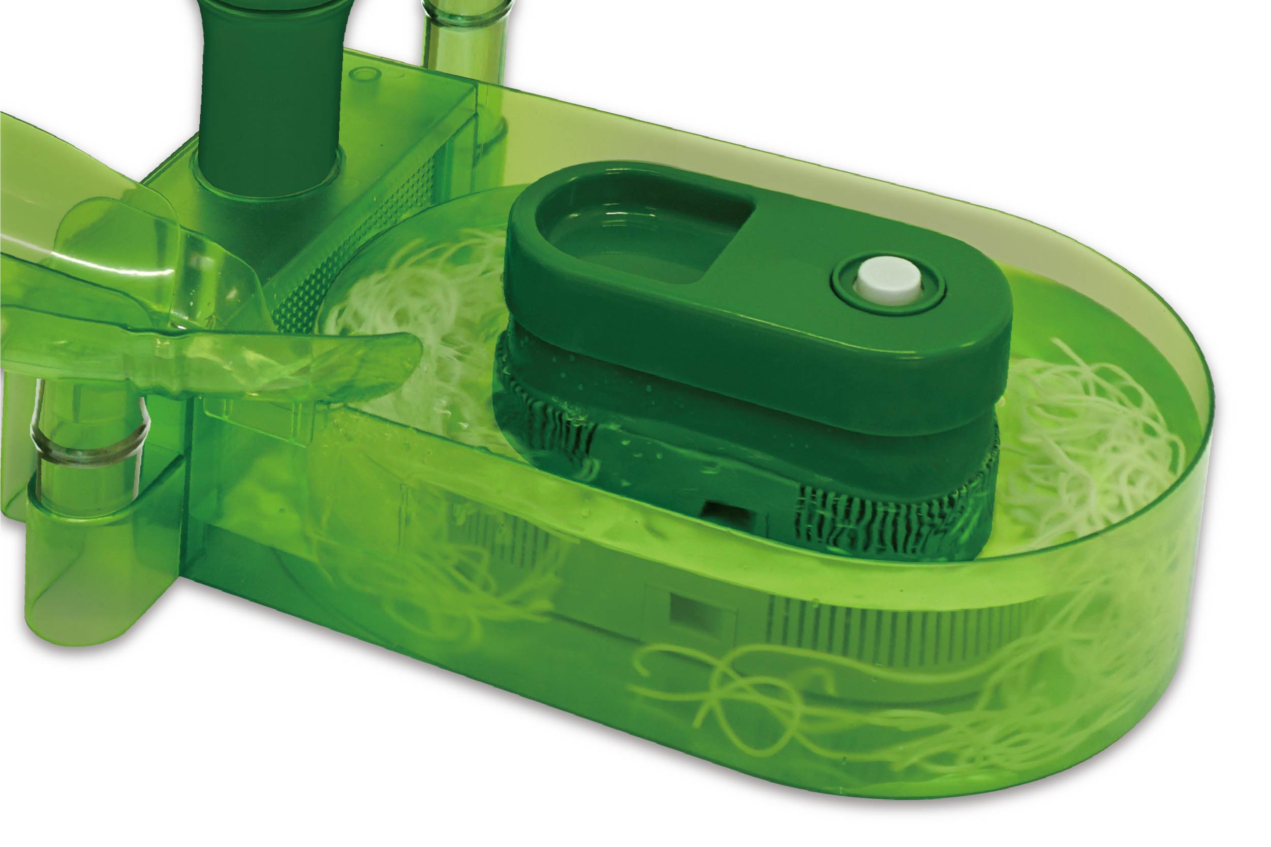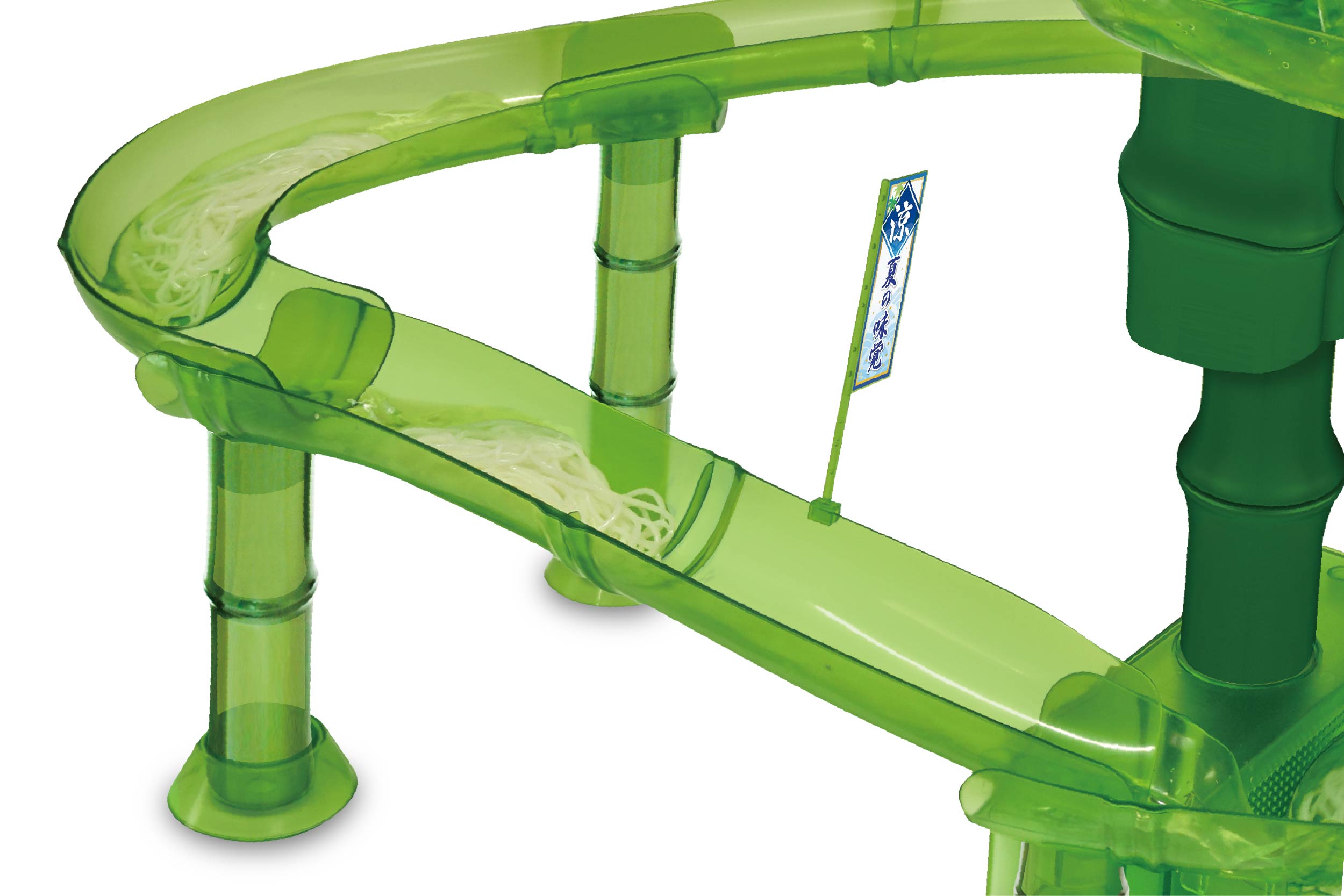 竹をイメージした立体型の流しそうめん器で、水と一緒に素麺がレール上を流れて楽しい!桶の中でも素麺がクルクル回る。清涼感あふれるクリアタイプで涼しさもUP。薬味トレイ付きでネギや生姜などもセット可能、美味しいそうめんを作れます。スルスルと流れてくる素麺をうまくキャッチして楽しもう♪