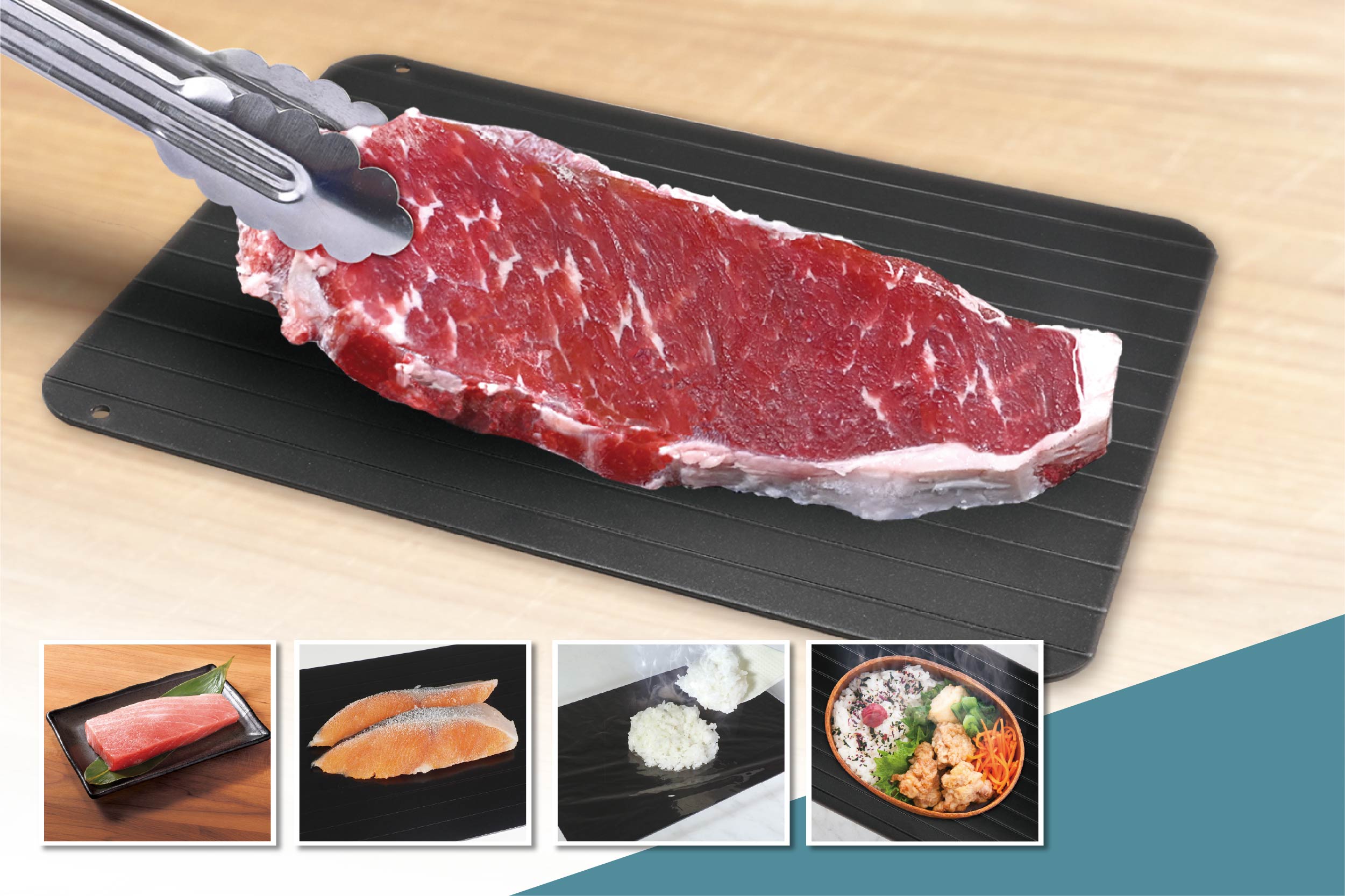 電子レンジの解凍ムラや粗熱取りの悩みを解決して料理の効率を大幅UP!凍った肉や魚をプレートに置くだけで最大8倍の解凍時間を実現。2枚使いで更に速く解凍することも可能です。熱伝導率に優れたアルミ素材のプレートがあなたの調理をアシストします!丸洗いできてお手入れ楽々!