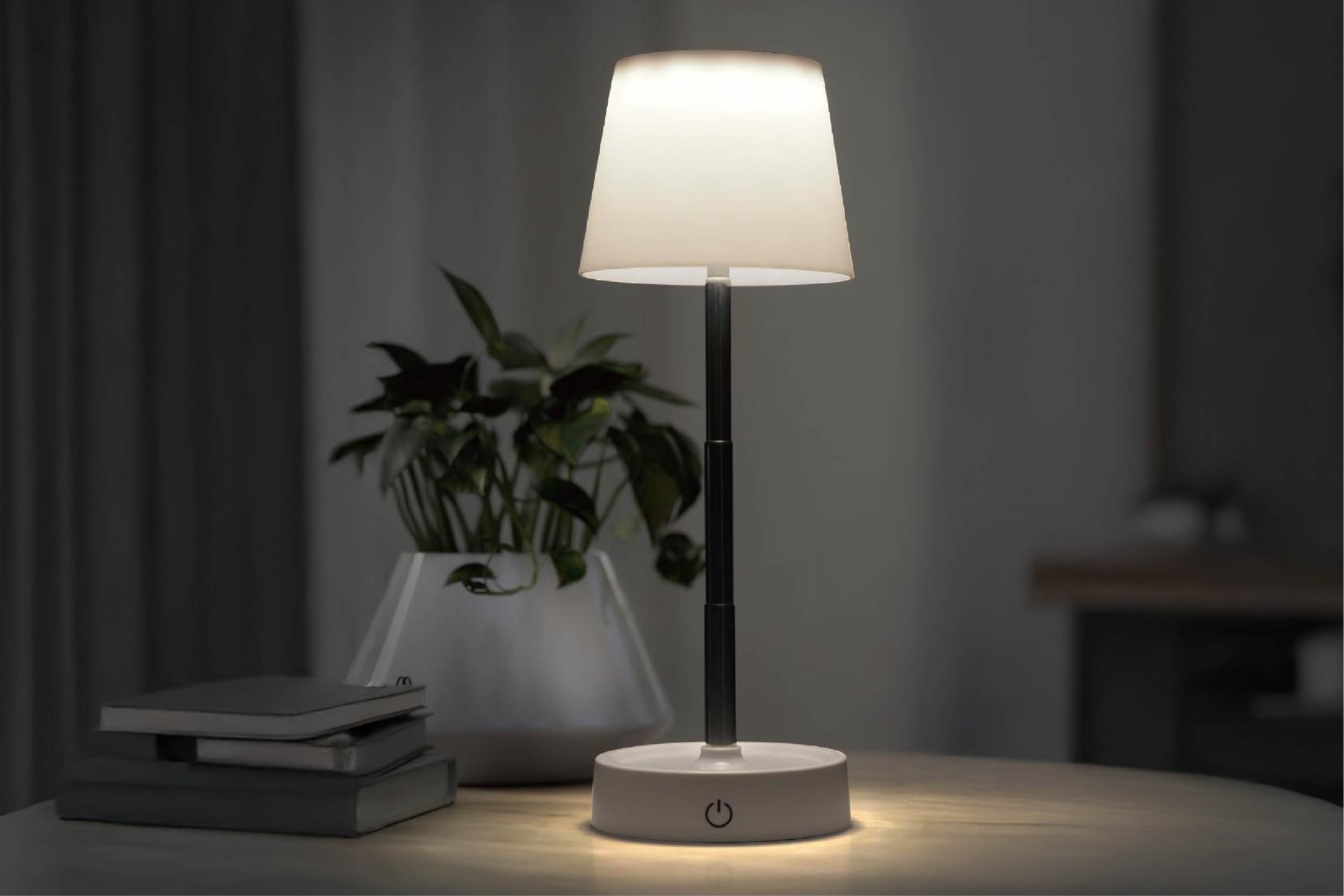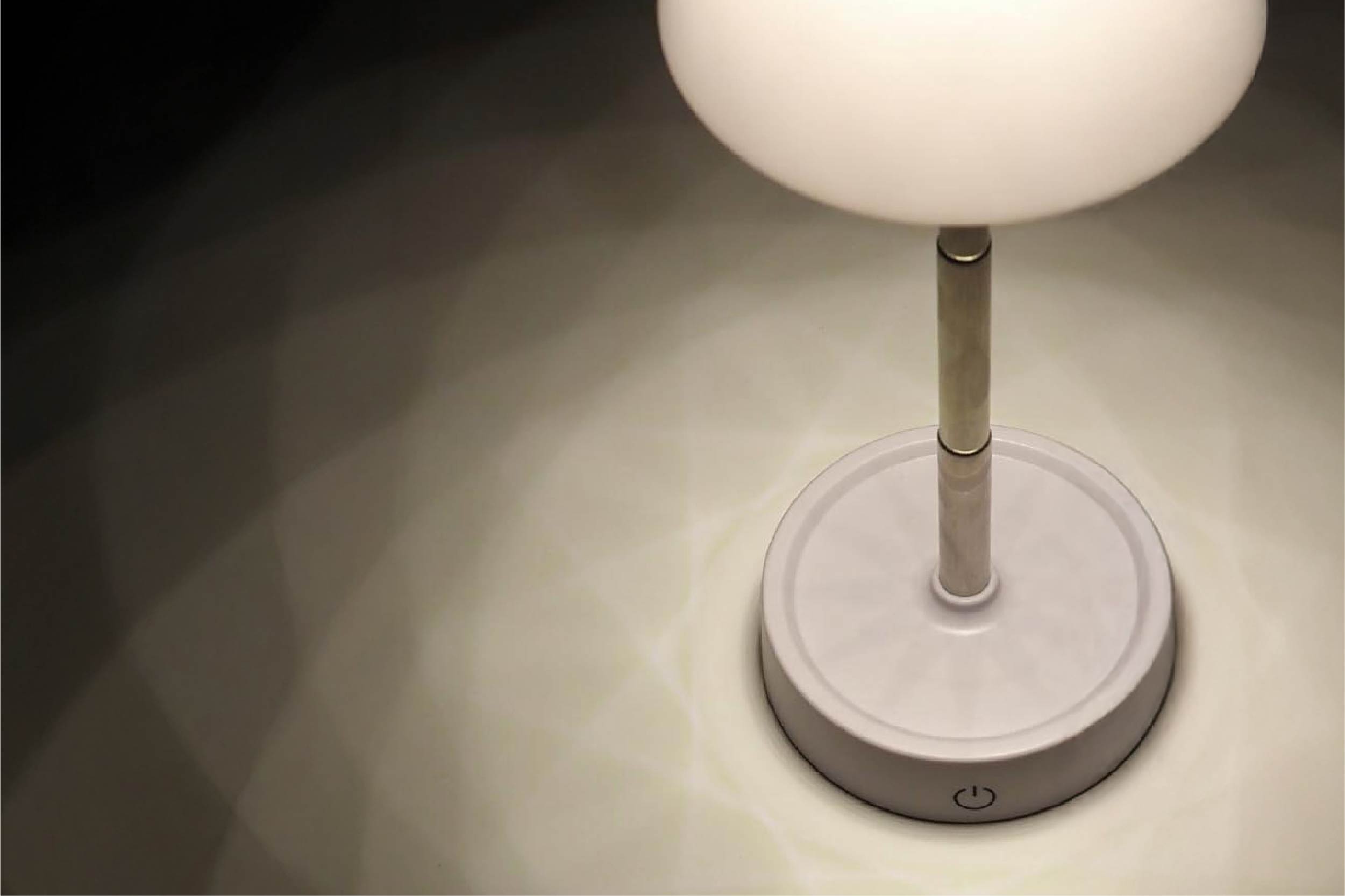 無段階調光と無段階伸縮が可能(最短約11.5〜最長約29.5cm)なスタンドライト。スタンドを短く使用してベッドサイドの優しい灯りに。スタンドを伸ばして手元を照らす照明として。放射線状の幾何学模様が部屋のムードを作り出します。タッチセンサー式で操作も簡単。充電式なのでコンセントのない場所や、多用途なシーンにご使用できます。