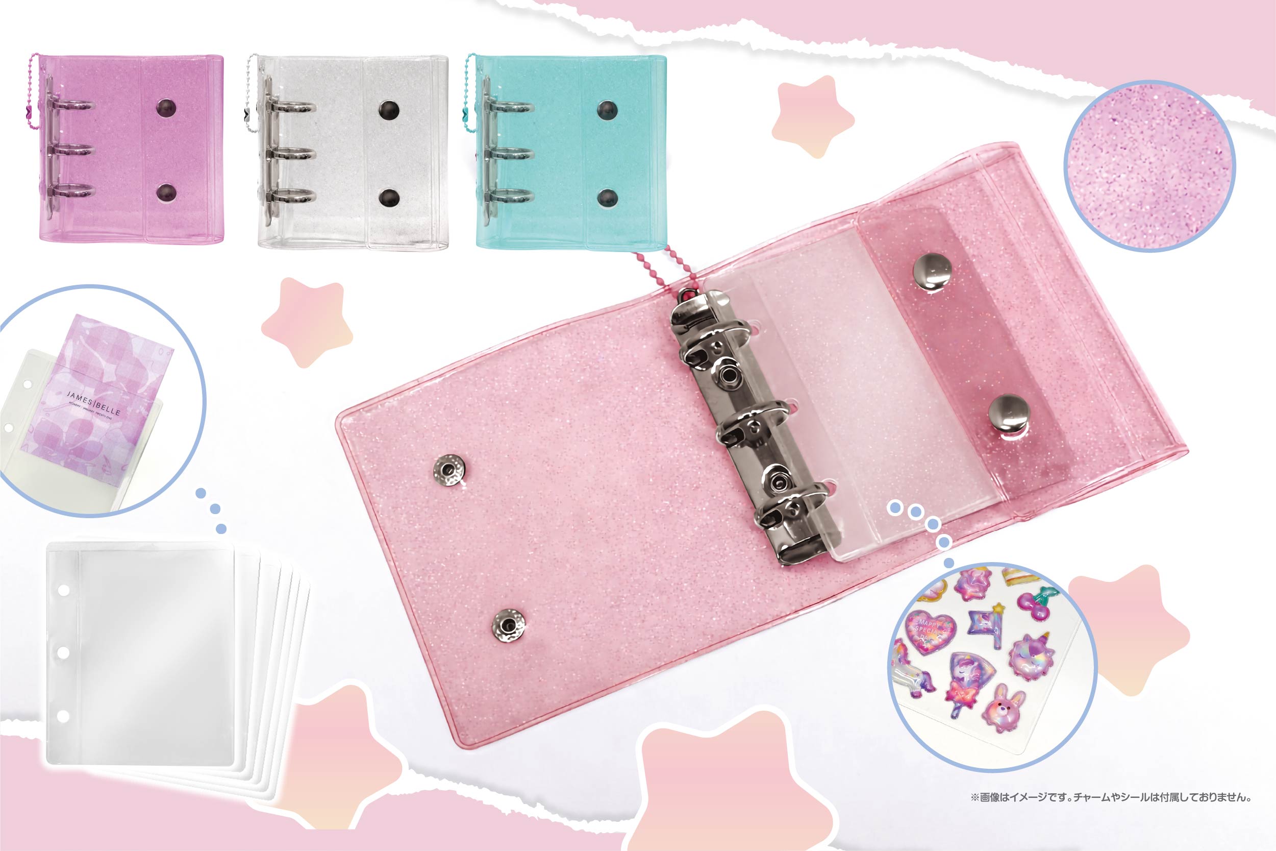 お気に入りのシールをきれいに整理・保管できるリフィル付きキララメシール手帳!集めたシールのコレクションはもちろん、整理にも!自由にデコれて自分好みにカスタマイズ♪チャームホール付きで好きなチャームもつけれます。コンパクトな手のひらサイズで持ち運びしやすく、いつでもどこでもシール選びが楽しめます。