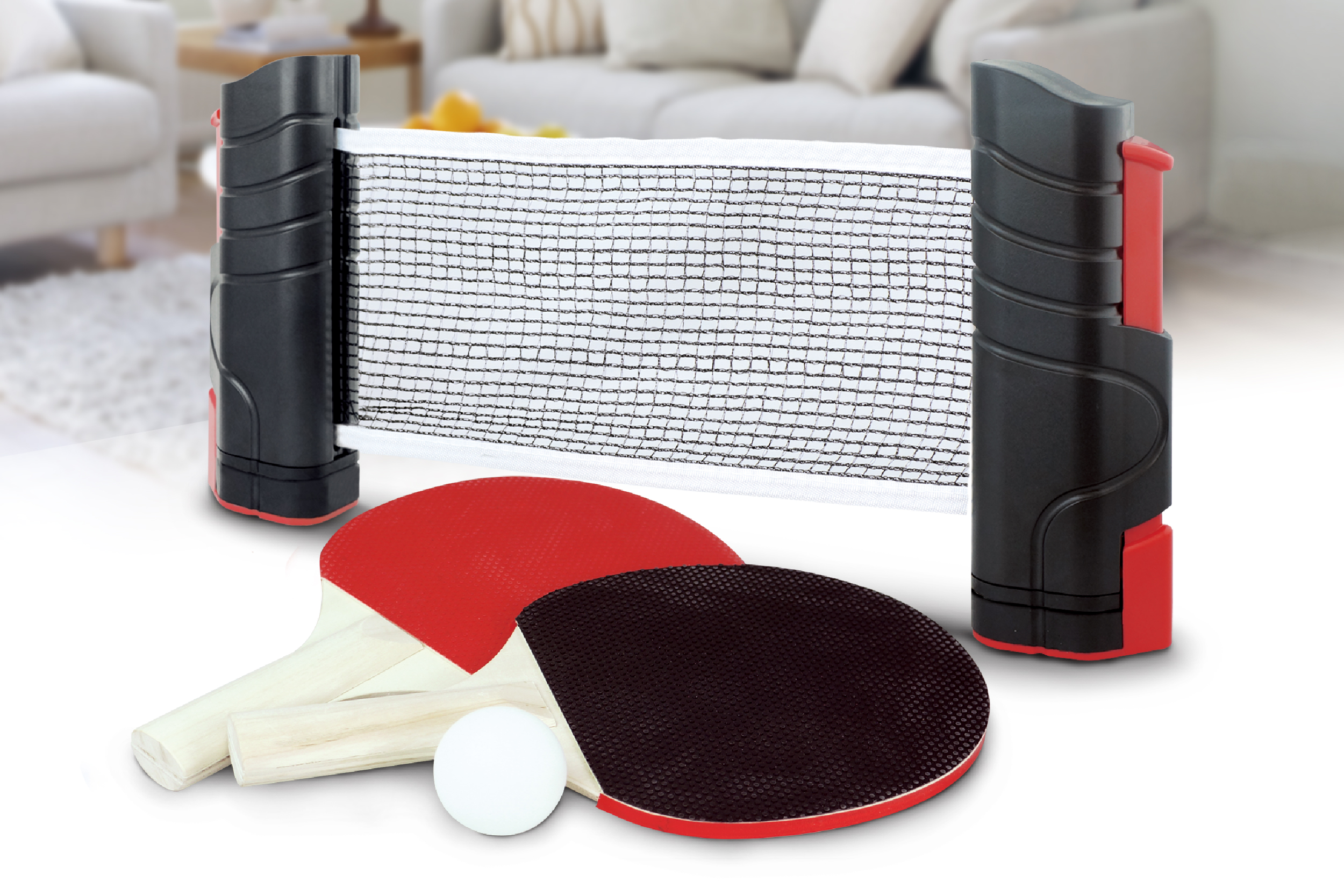 ネット付きの卓球セット。自宅や会社のテーブルにセットするだけで、テーブルが卓球台に早変わり!!ピンポン球とラケットが2本が付属しているので、テーブルがあればどこでも卓球バトルを楽しめます。ネットはポータブル式で簡単に収納可能、使用時も広げるだけで簡単に設置可能。友達や家族、会社でも楽しめるポータブル卓球セット。