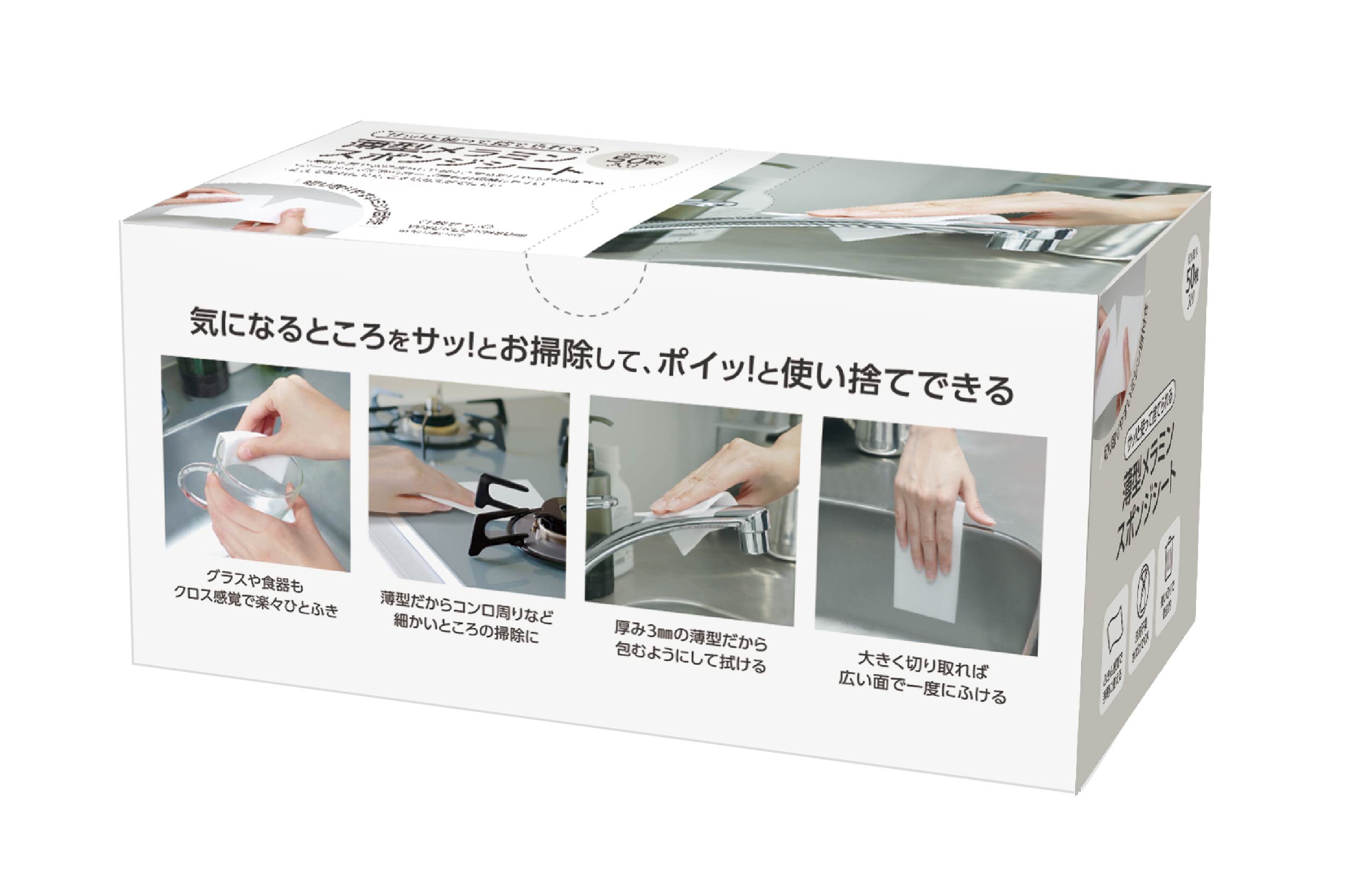 カーブ面も掃除しやすいシートタイプのメラミンスポンジが登場!切り取りやすいミシン目付きで50枚入り。クロス感覚で楽々ひとふき、細かいところの掃除や広い面で一度に拭けます。気になるところをサッ!とお掃除できとっても便利!使い切りで衛生的です。