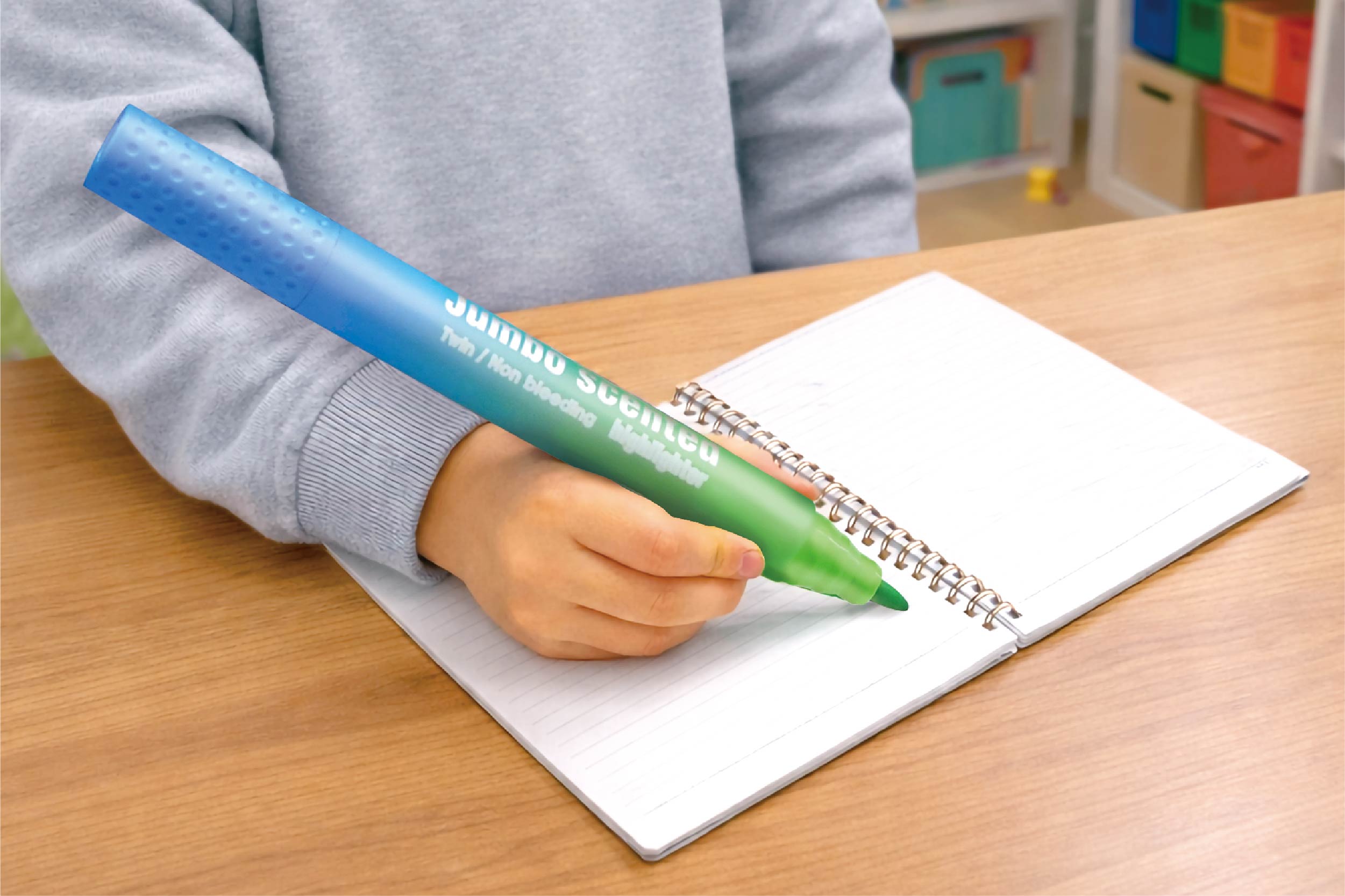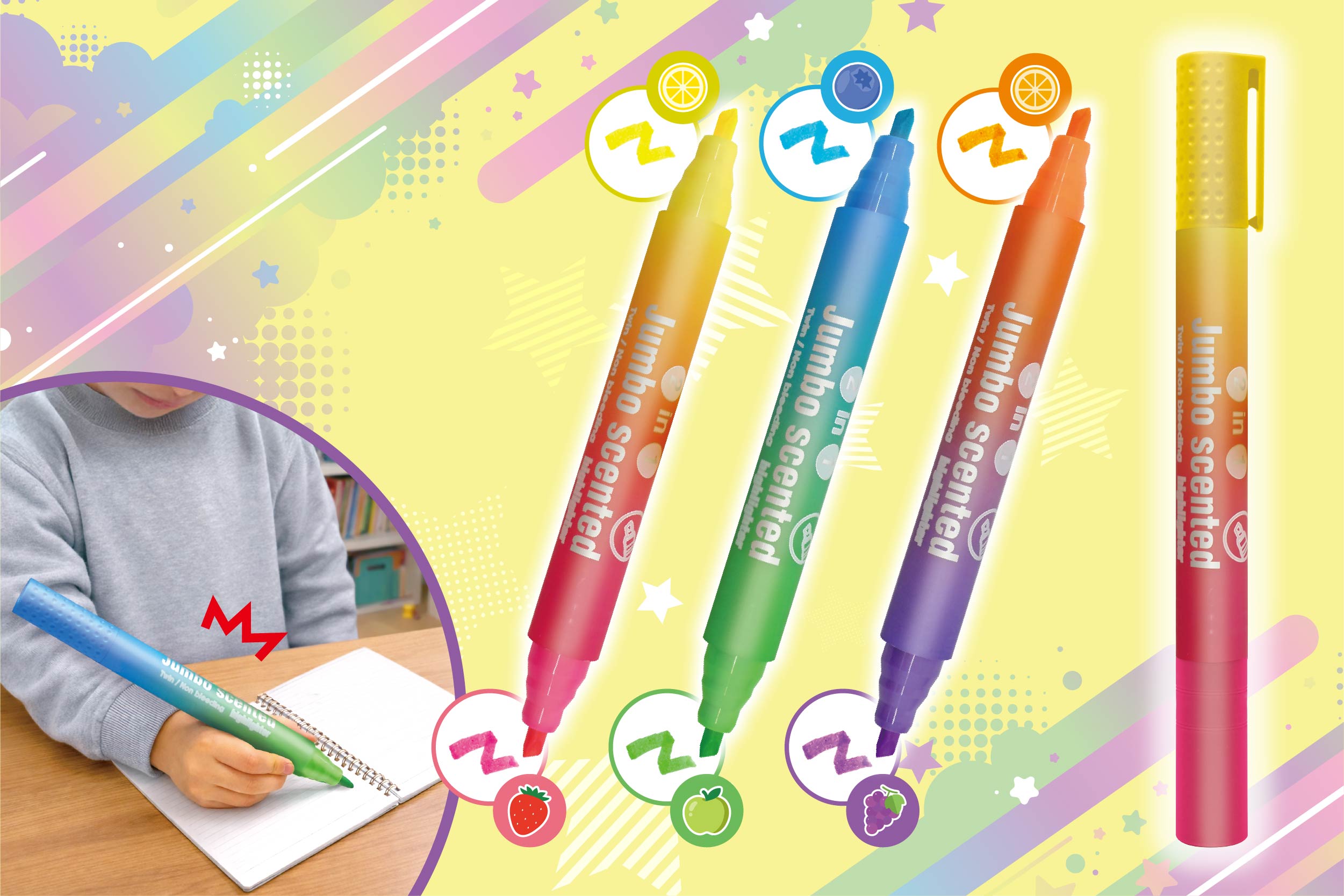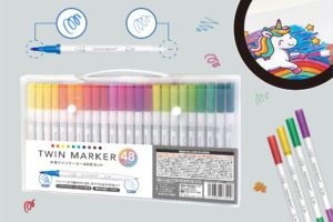 全長24.5cmのどでかツインマーカー!どでかサイズで、存在感バツグンです。1本で2色使え、さらに楽しい香り付きインク採用でほんのり香ります。ポスター、POP、イラスト、学校の工作などにぴったりです。