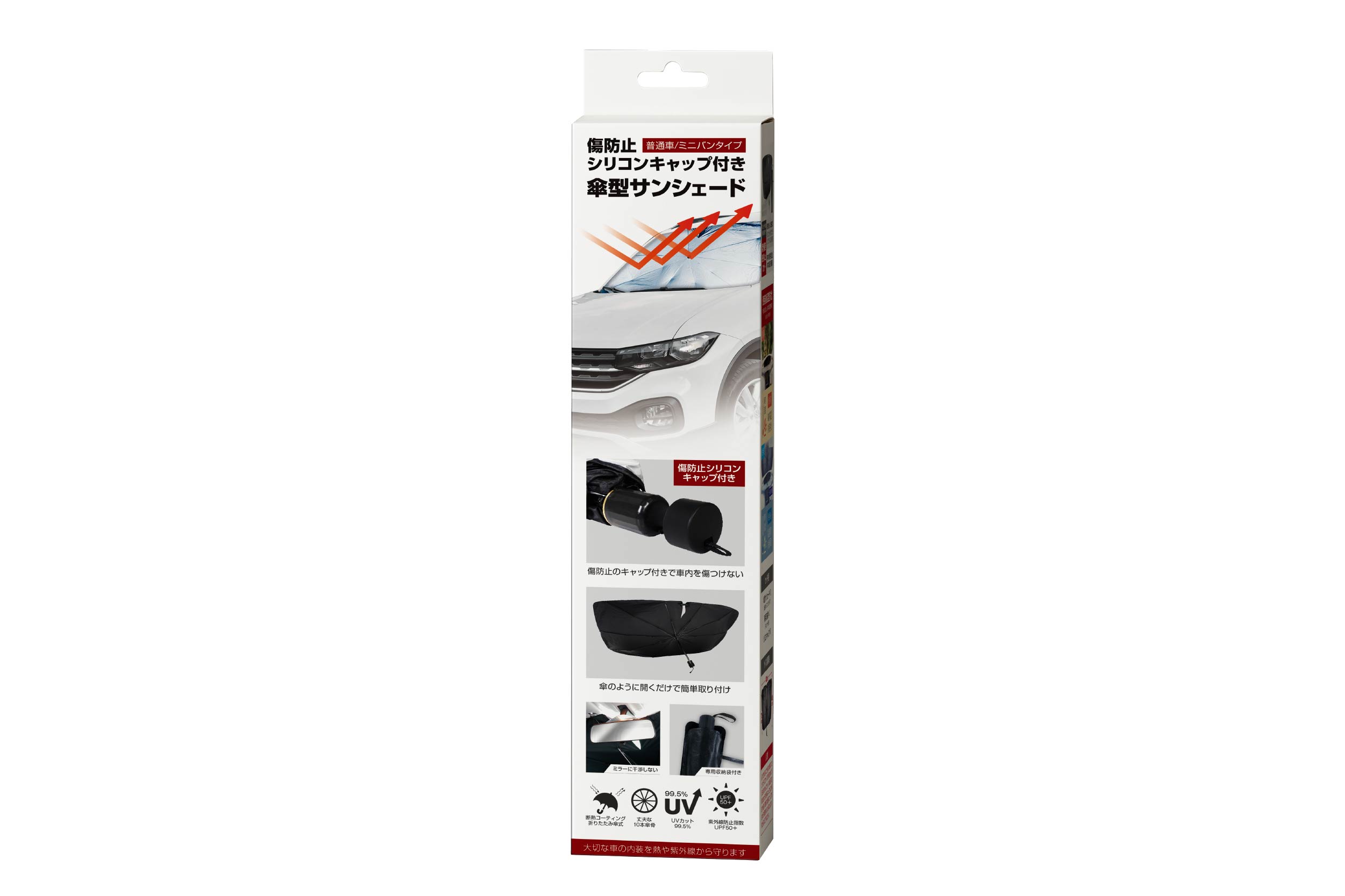 傷防止シリコンキャップ付きの傘型サンシェード登場!シリコンキャップで車内を傷つける心配がありません。傘のように「パッ」と開いて熱や紫外線99.5%以上カット!普通車・ミニバンタイプのフロントガラスのサイズ(約W132cm×H75cm)までカバーできます。PUレザー仕様の専用収納袋付きで収納もコンパクトに。車内温度の上昇防止や仮眠時の目隠しにおススメです。丈夫な10本傘骨なので耐久性もバッチリ!