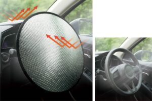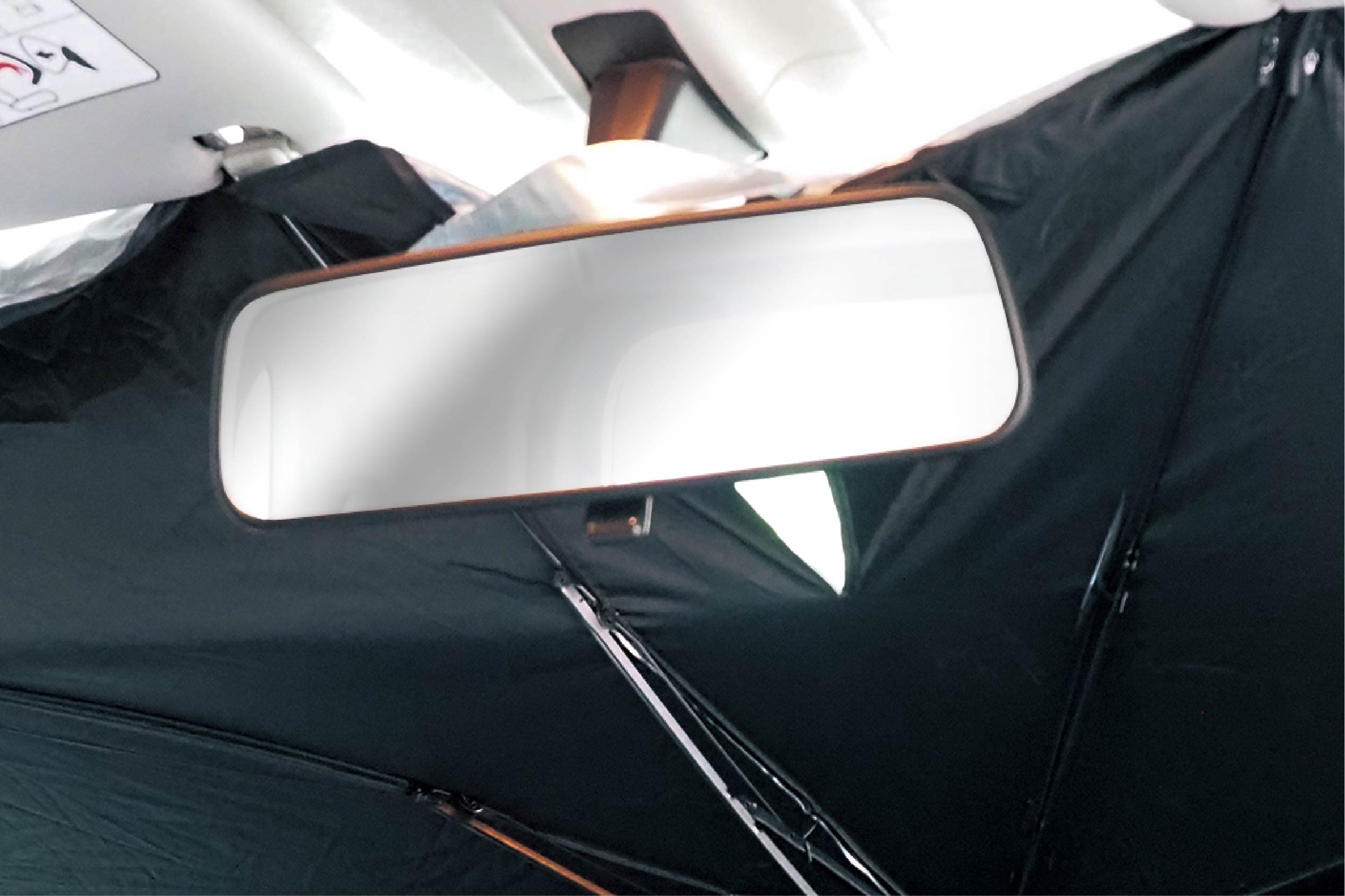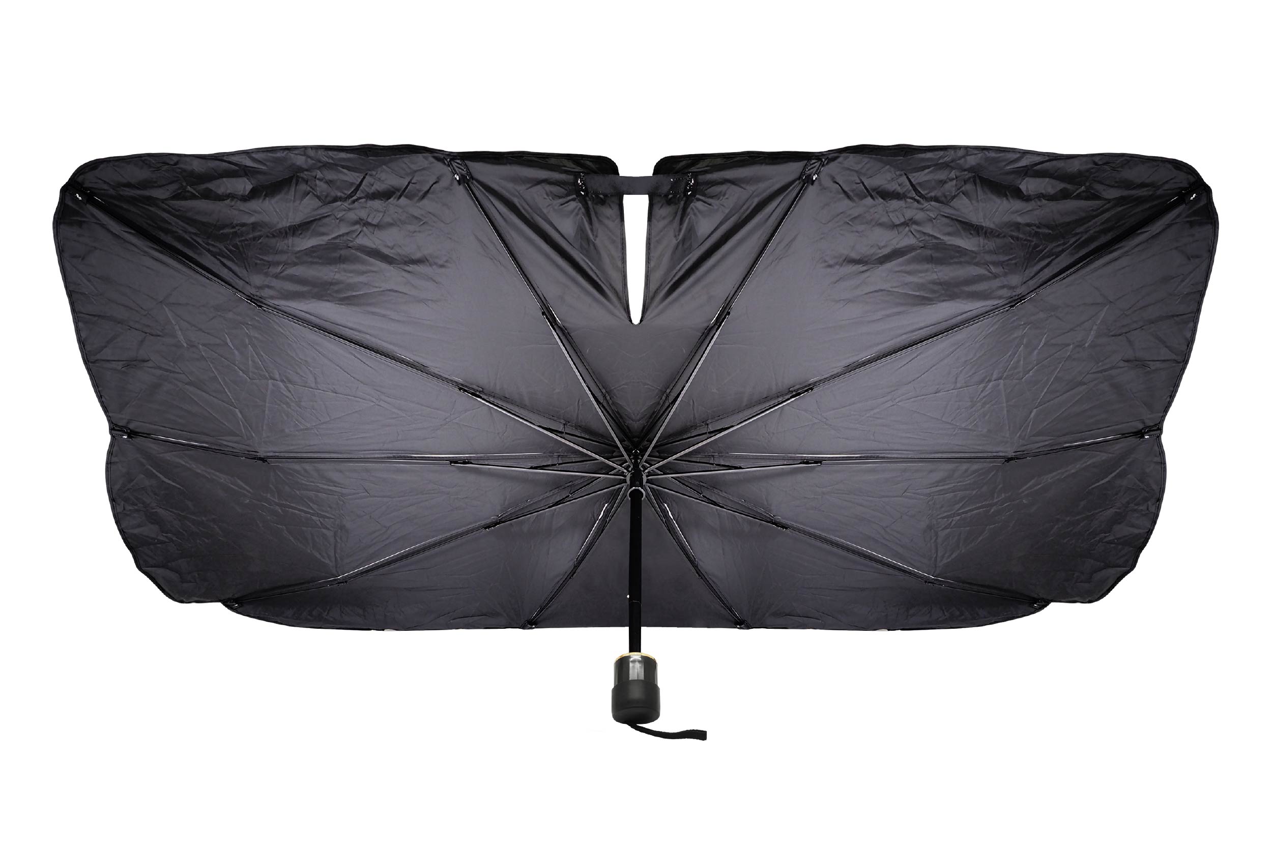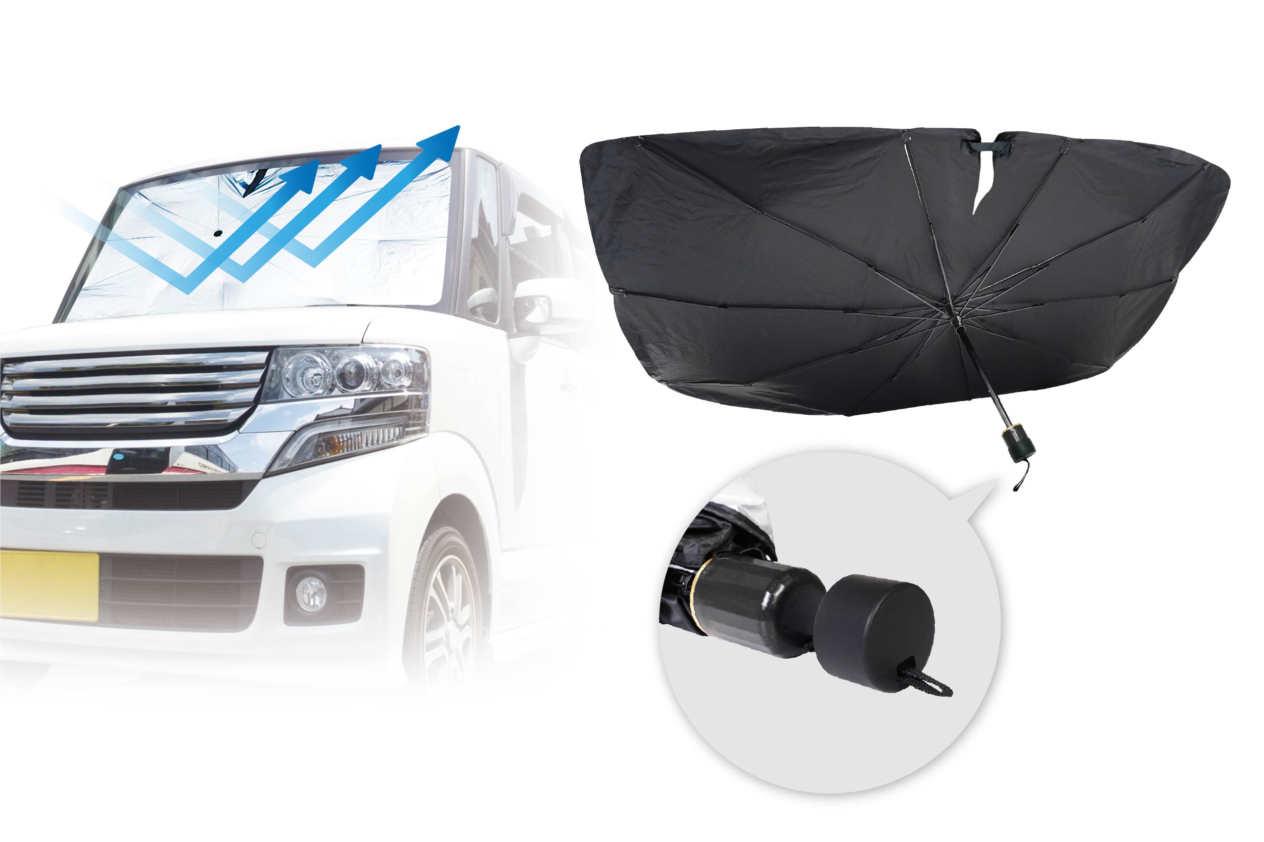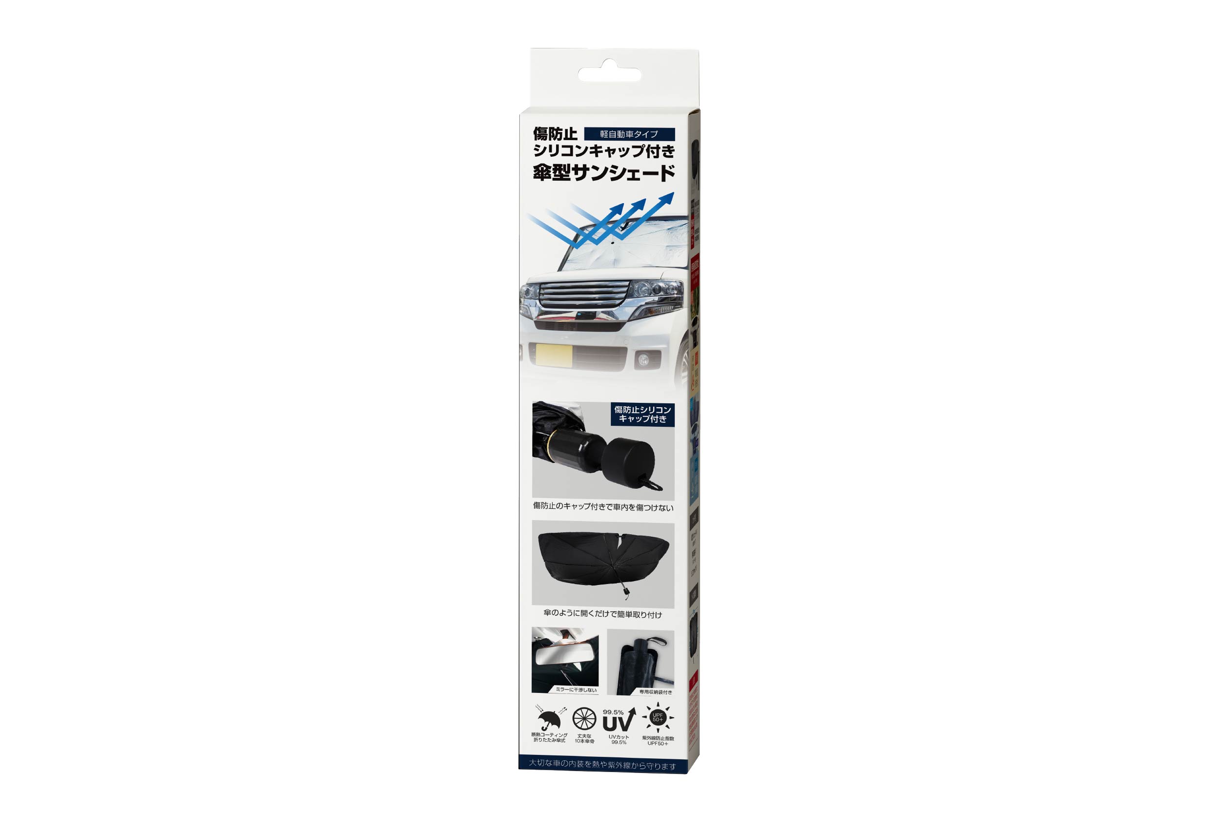 傷防止シリコンキャップ付きの傘型サンシェード登場!シリコンキャップで車内を傷つける心配がありません。傘のように「パッ」と開いて熱や紫外線99.5%以上カット!軽自動車のフロントガラスのサイズ(約W111cm×H62cm)までカバーできます。PUレザー仕様の専用収納袋付きで収納もコンパクトに。車内温度の上昇防止や仮眠時の目隠しにおススメです。丈夫な10本傘骨なので耐久性もバッチリ!