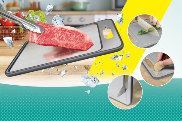 1つで4つの機能!熱伝導で素早く解凍する解凍プレートはもちろん、まな板・おろし器・包丁研ぎが付いたマルチプレートのワイドサイズが登...